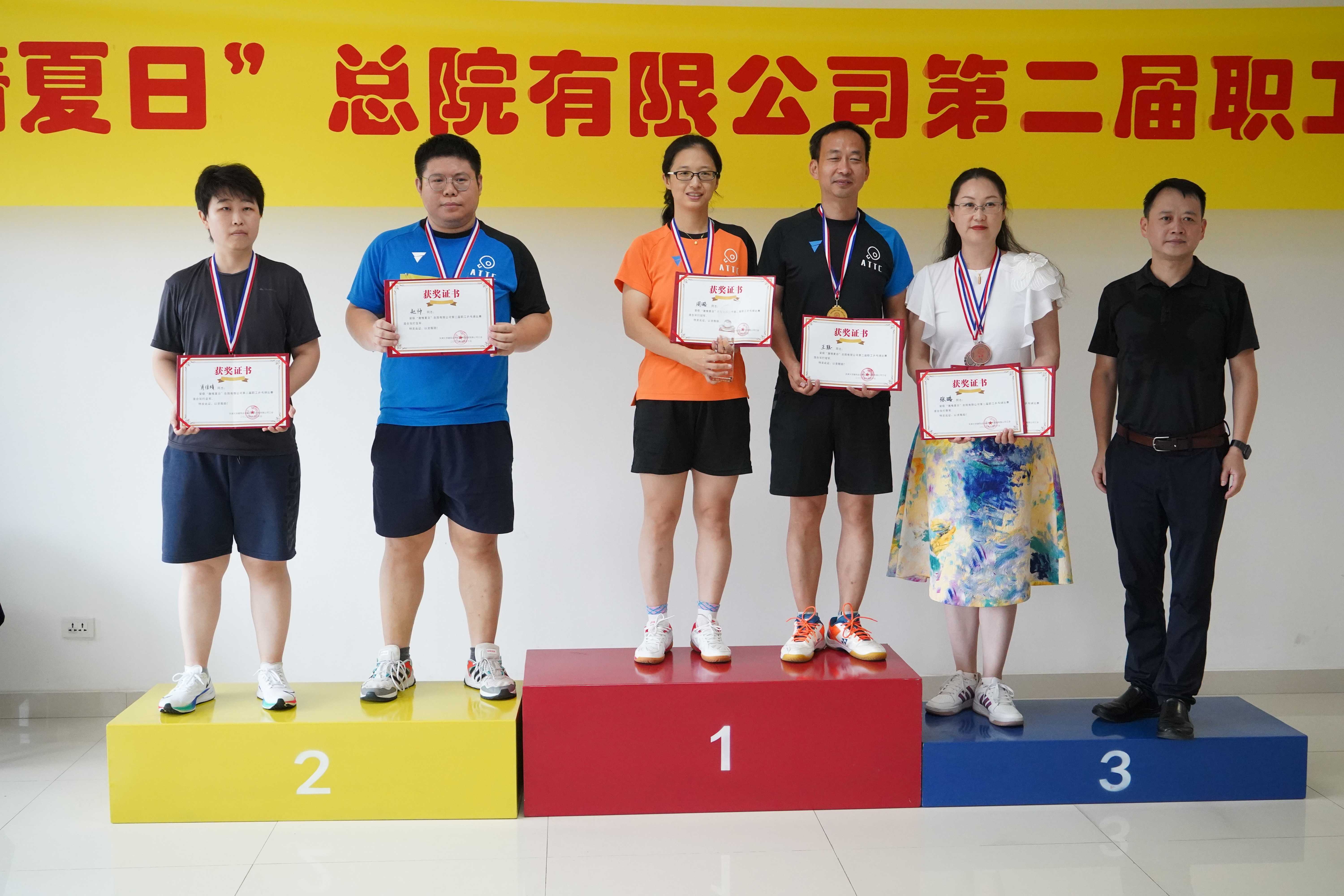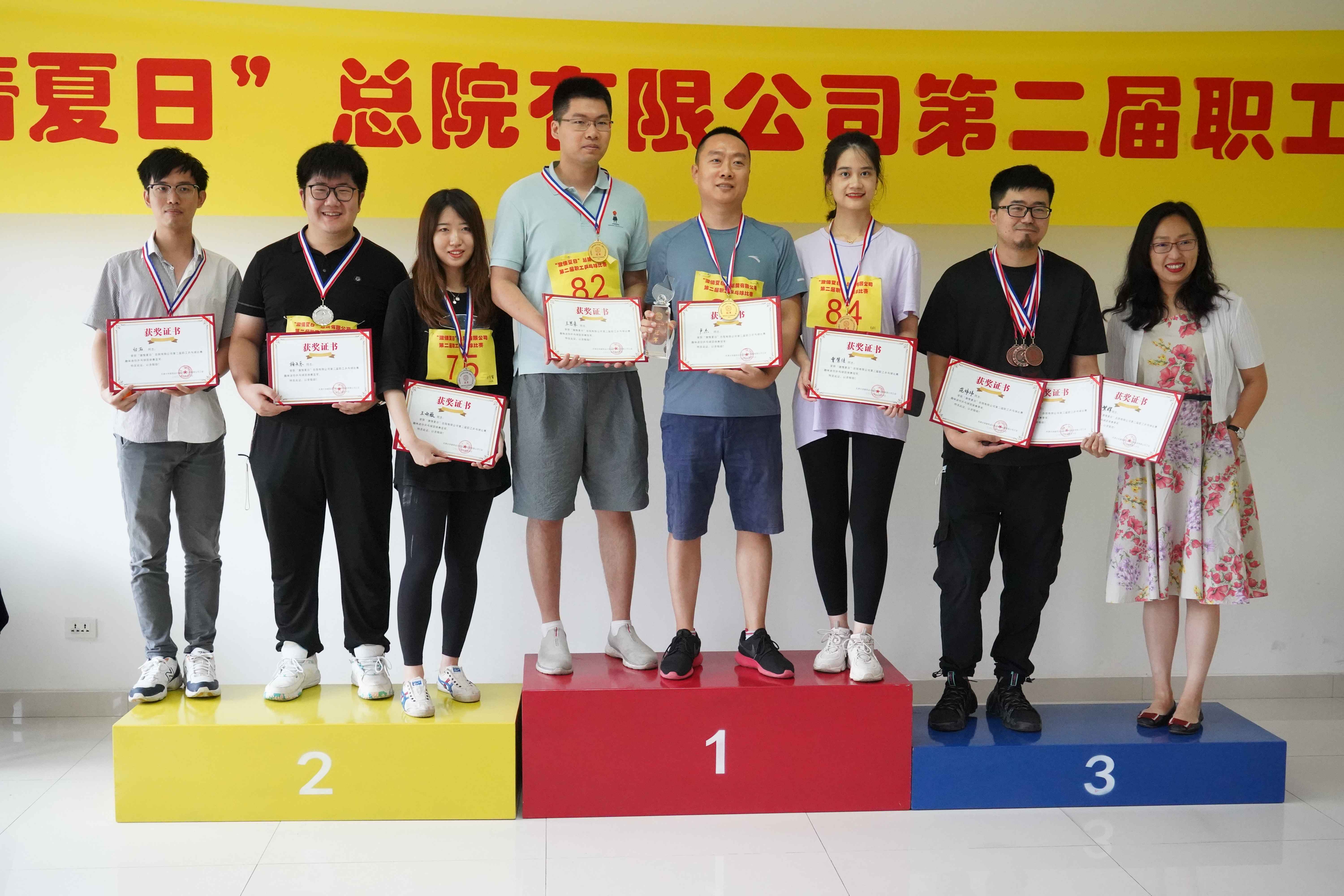 經過三天中午的角逐,在強手如林的男單比賽中,設計八院趙帥技壓群雄,一舉奪得冠軍。女單比賽中,選手們表現出昂揚向上的精神風貌和靚麗風采,最終設計三院周璐奪得了冠軍。雙打比賽的選手們也展現了精湛的球技和良好的心理素質,設計八院的趙帥和孫峣奪得男子雙打冠軍,設計三院的周璐和王聰收獲混合雙打冠軍。本屆比賽新設置的趣味迷你乒乓球團體賽也吸引了眾多高手參加,冠軍最后由規劃二院的王恩來、盧杰和保護規劃所的曹紫佳奪得。正式比賽結束后,孫永利總經理與剛剛奪得男子單打冠軍的趙帥進行了一場表演賽,兩人的精彩球技贏得一陣陣喝彩。最后進行了隆重的頒獎儀式,領導們為獲獎選手頒發了獎杯、獎牌和證書并合影留念。本屆比賽在拉德斯基進行曲的歡快節奏中圓滿結束。