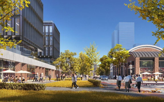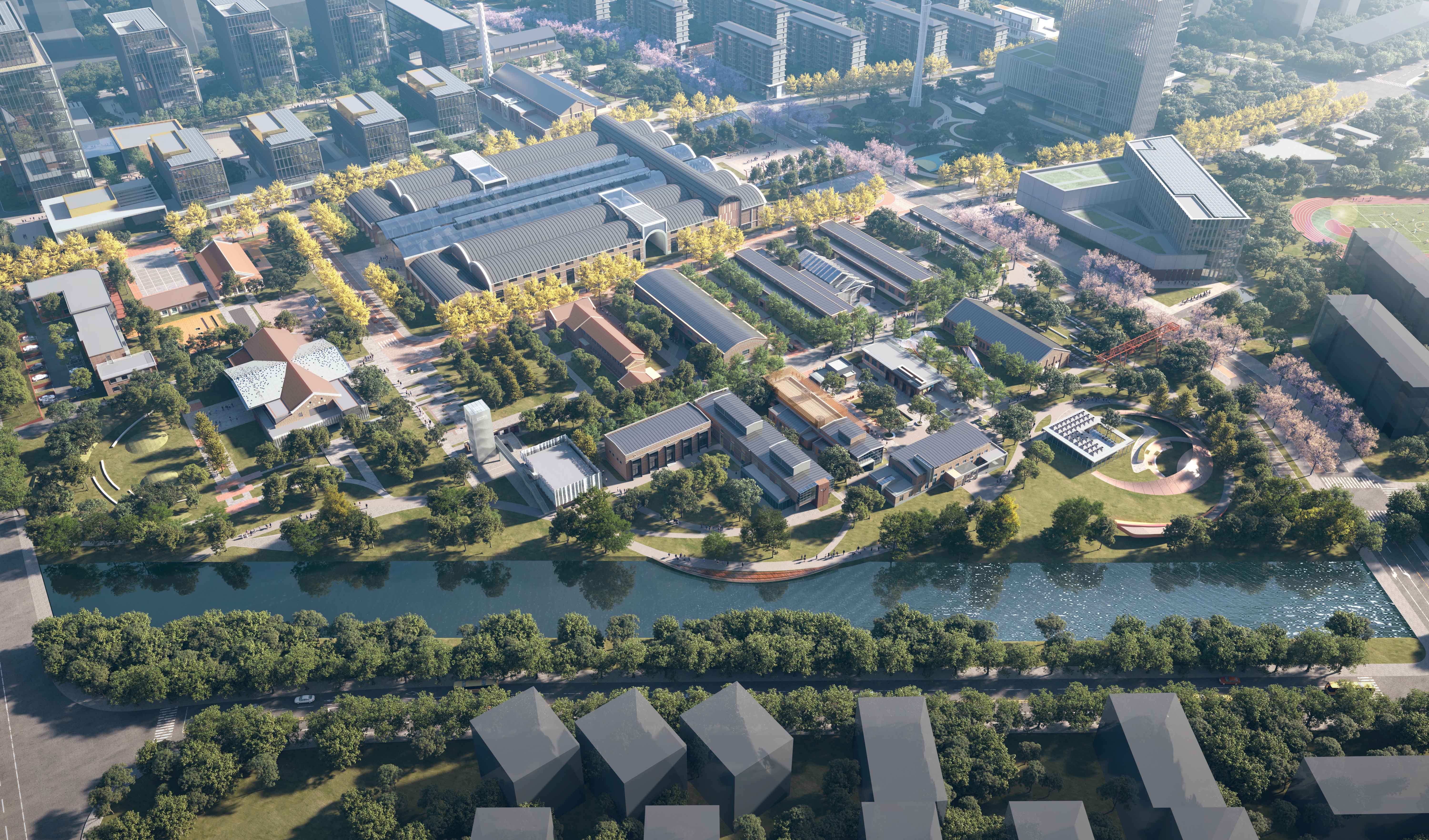 規劃打造“一心四坊、公園街區”的整體結構,以金二車間改造而成的中央樞紐作為片區核心,規劃“濱水創意街區、總部創研街區、門戶創享街區、未來創智社區”四大混合街坊,各街坊由連續舒適的街道體系串聯,共享開放的公共空間體系相互聯動,最終形成一個舒適好逛、無界復合的公園體驗街區。