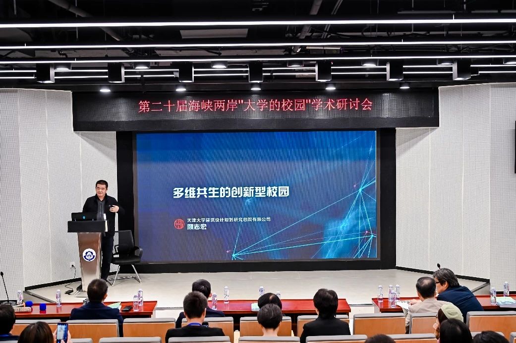 為期兩天的會議分為校園設計、校園建筑歷史、綠色可持續校園、校園建筑歷史與遺產保護、校園與城市更新發展、校園模式變革、建筑教育和博士生論壇等專題報告。其中,天津大學建筑設計規劃研究總院有限公司副總建筑師顧志宏在“校園設計”專題環節為與會嘉賓帶來《多維共生的創新型校園》的主旨報告。