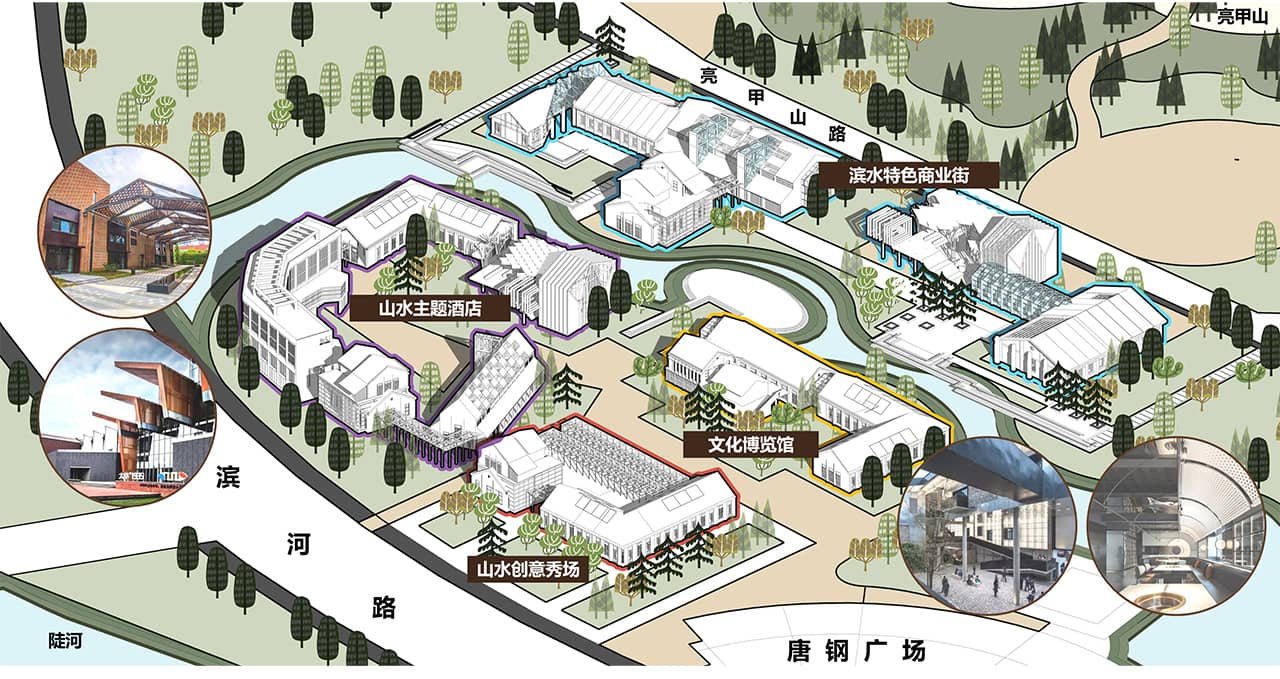 陡河是唐山人的母親河,而隱沒在唐鋼院內(nèi)的亮甲山則是唐山的坐標原點。隨著唐鋼的搬遷,亮甲山重現(xiàn)于世,規(guī)劃對亮甲山進行生態(tài)修復,圍繞出土動物化石洞穴、出土文物遺址、藥王廟遺址等打造唐山歷史起源公園,做到還山于民。在原唐鋼廣場區(qū)域,擴大陡河水面,打造水綠商街游為一體的湖光山色區(qū)域,做到還水于民。工業(yè)風的建筑中植入新的功能業(yè)態(tài),古今對話,工業(yè)融入山水,歷史照進現(xiàn)實。