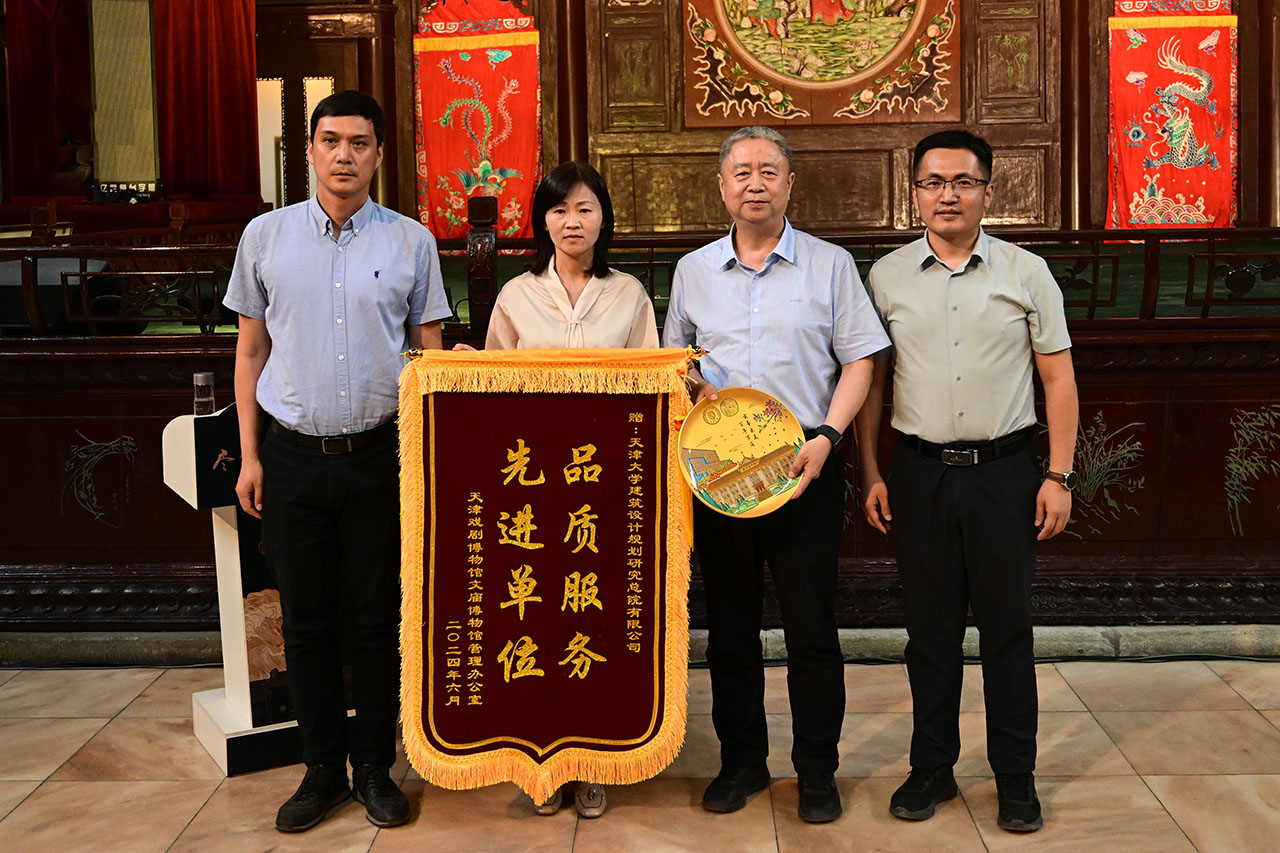 會上,廣東會館的主管單位天津戲劇博物館文廟博物館管理辦公室為天大設(shè)計總院頒發(fā)“品質(zhì)服務(wù)、先進單位”錦旗。