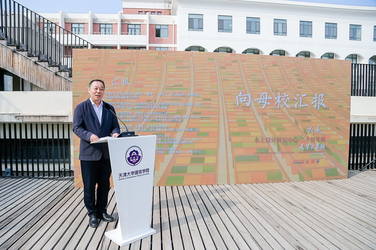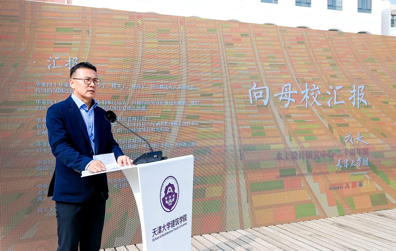 諶謙代表天大設計總院向來賓表示歡迎,向崔院士及其團隊表示祝賀。他表示本次展覽以崔院士本土設計理論的價值觀為核心,呈現了在這20年間具有代表性的一批項目和項目背后的思考,全面體現了本土設計理念對于文化、歷史、城市、風景、綠色、鄉土的關注和回應。天大設計總院已歷經72年,取得了豐碩的成果,未來在各位前輩及師長的提攜、培養和鼓勵下,在天大設計總院千余員工的不懈努力下,會更好地成長,砥礪前行!