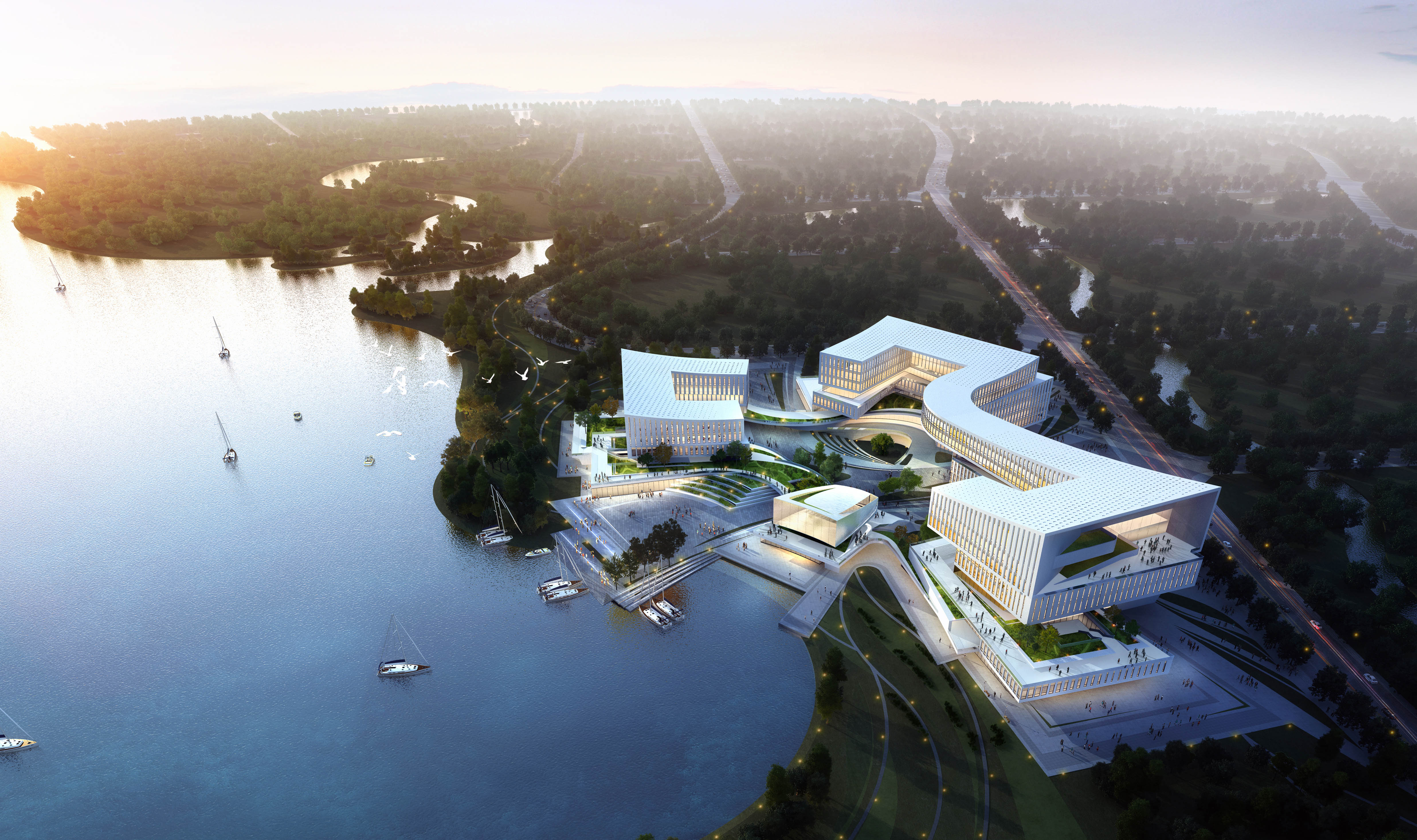 成都市羊安產(chǎn)業(yè)新城綜合運(yùn)營(yíng)中心整體建筑群呈現(xiàn)舒展向上的態(tài)勢(shì),如展開(kāi)的羽翼,建筑形體的高低錯(cuò)落和建筑頂部的起翹形成舒展優(yōu)美的建筑天際線,建筑表皮通過(guò)精細(xì)靈動(dòng)的格構(gòu)與純凈的白色調(diào)立面材質(zhì)形成富有動(dòng)感與韻律的展翼形態(tài),體現(xiàn)“展翼羊安,夢(mèng)想啟程”的設(shè)計(jì)主題和靈動(dòng)現(xiàn)代的設(shè)計(jì)語(yǔ)言,以成都市自古以來(lái)具有開(kāi)創(chuàng)精神的城市品格和站在面向未來(lái)的嶄新起點(diǎn)上,以成都市羊安產(chǎn)業(yè)新城綜合運(yùn)營(yíng)中心為核心開(kāi)創(chuàng)嶄新篇章的蓬勃?dú)鈩?shì)。
