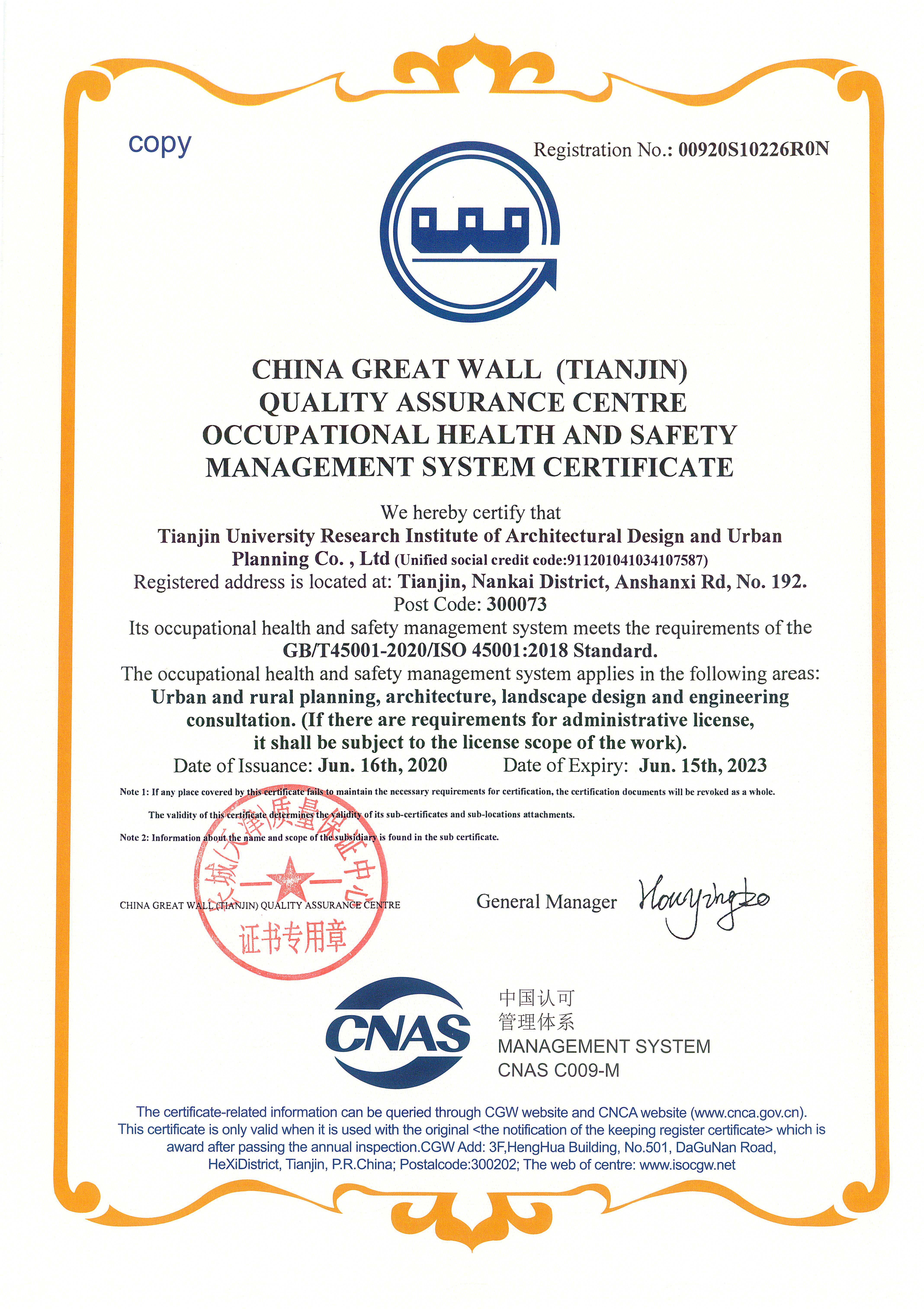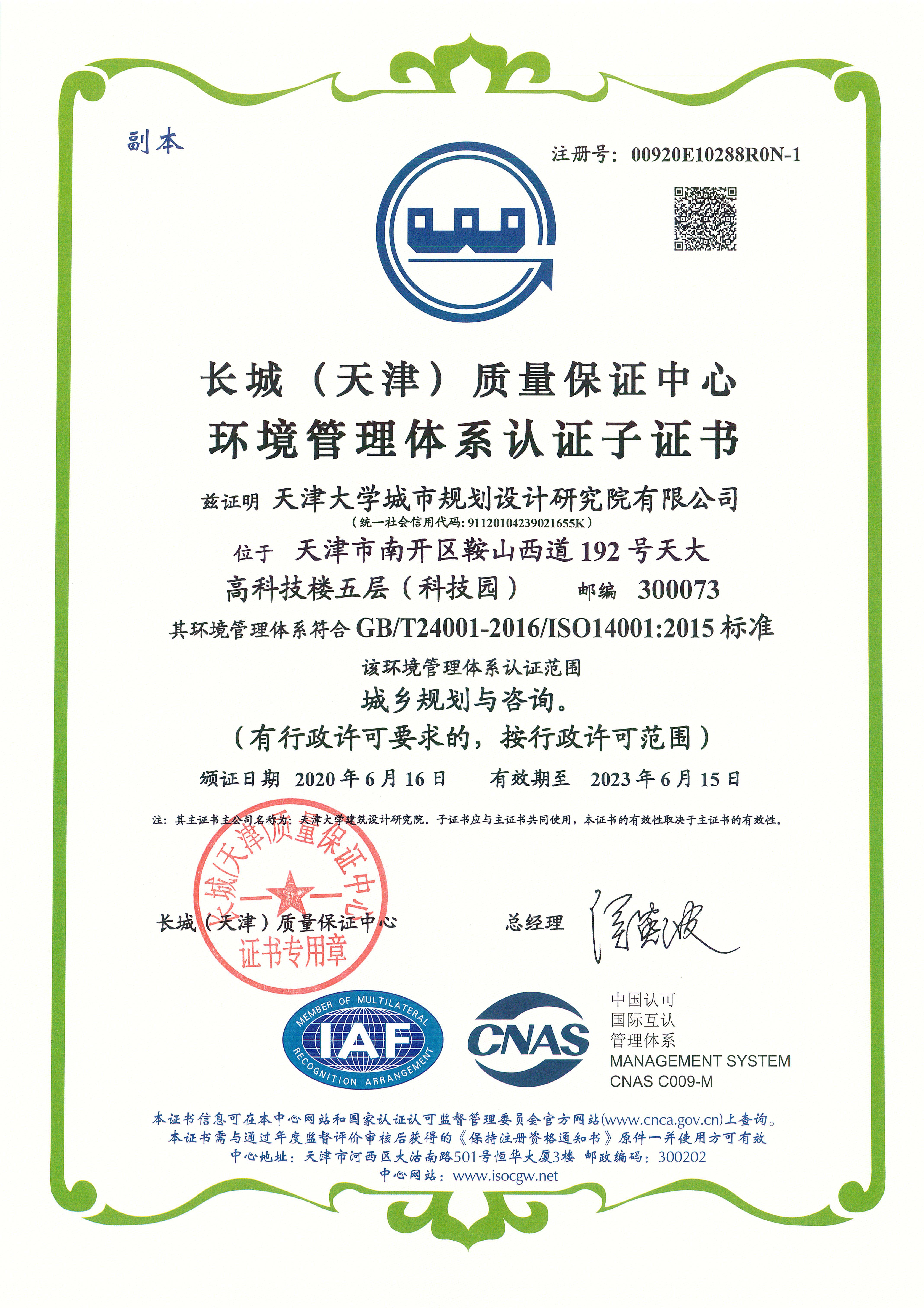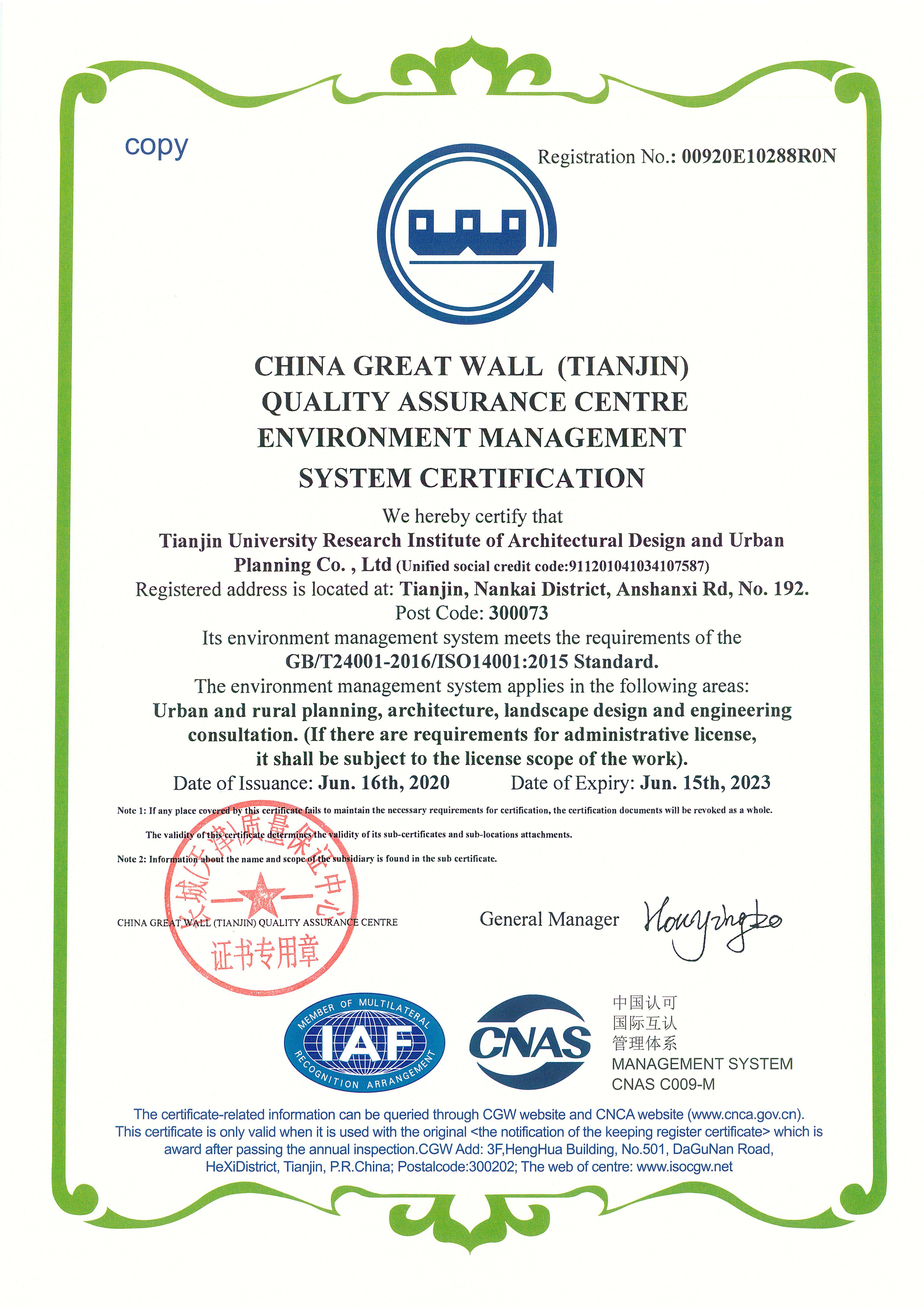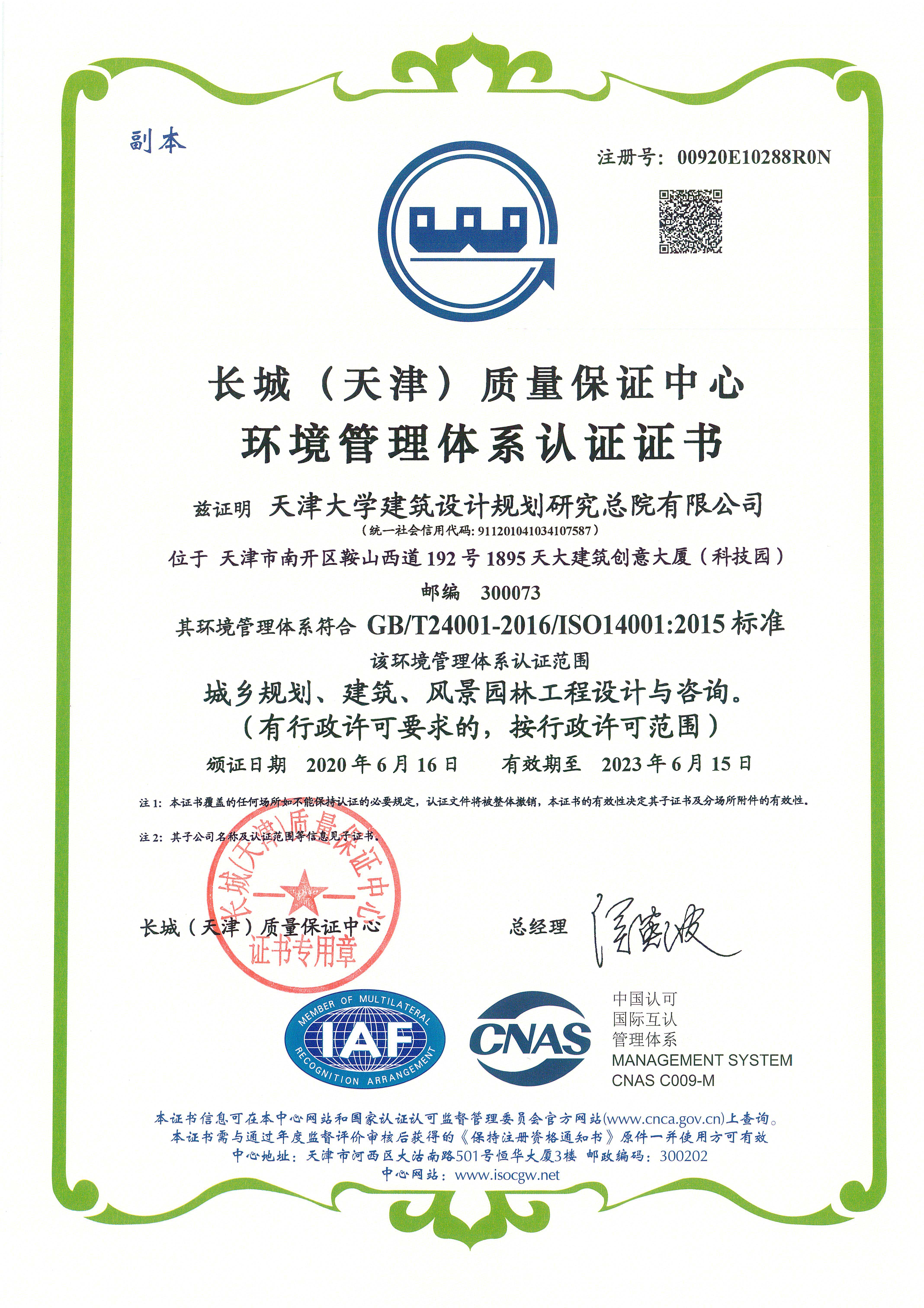 天津大學建筑設計規劃研究總院有限公司及天津大學城市規劃設計院有限公司獲得質量、環境、職業健康安全管理體系認證證書。