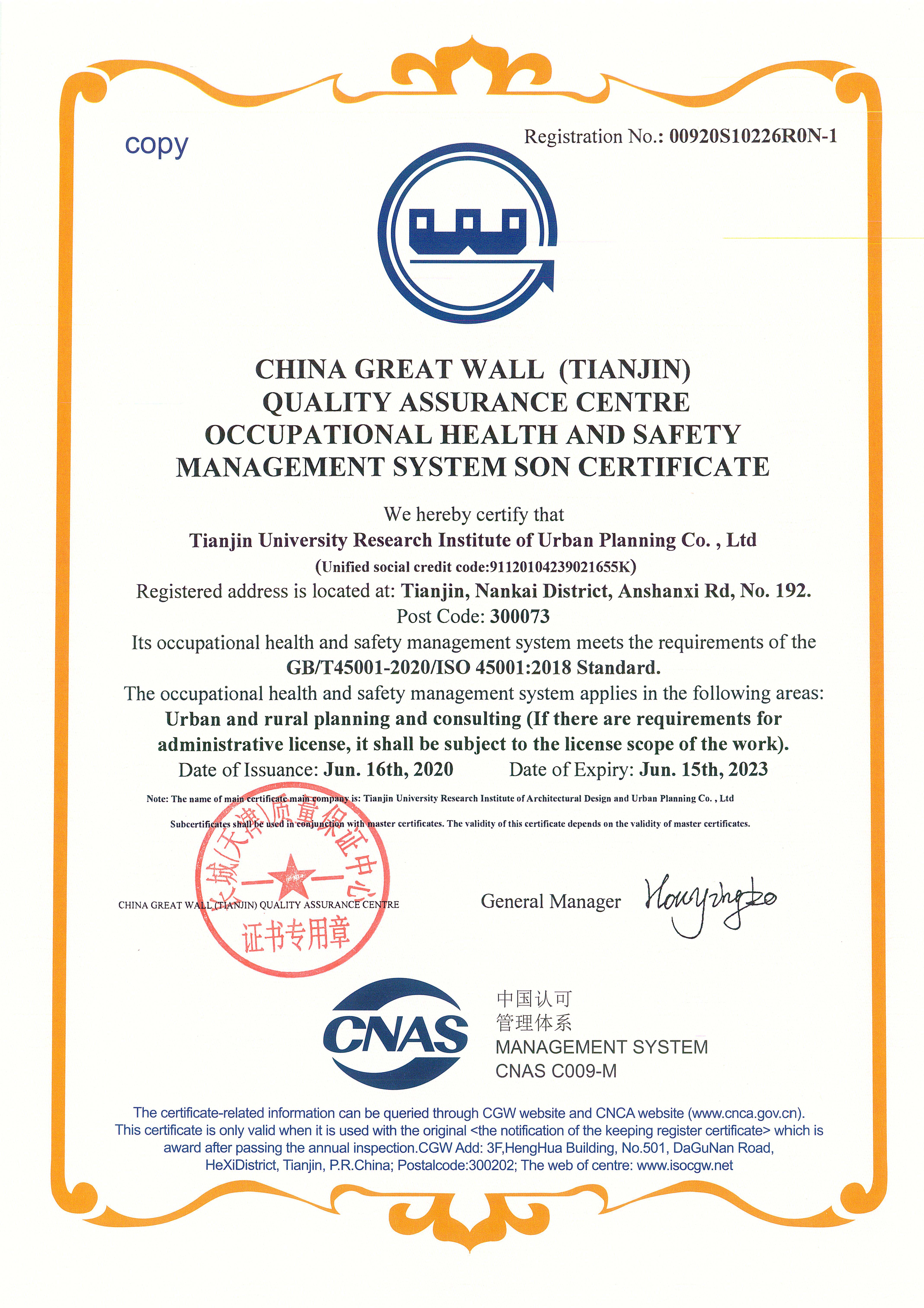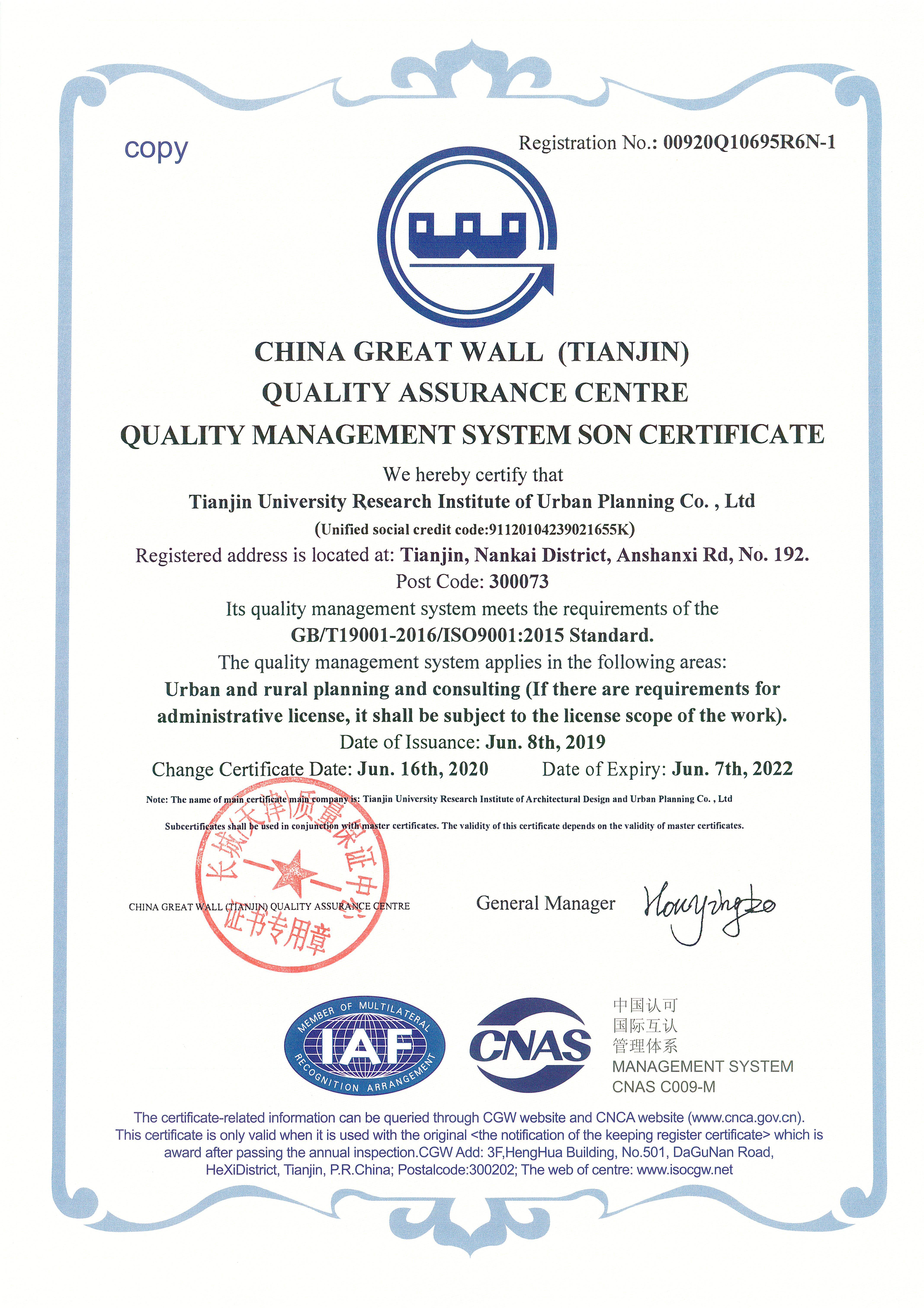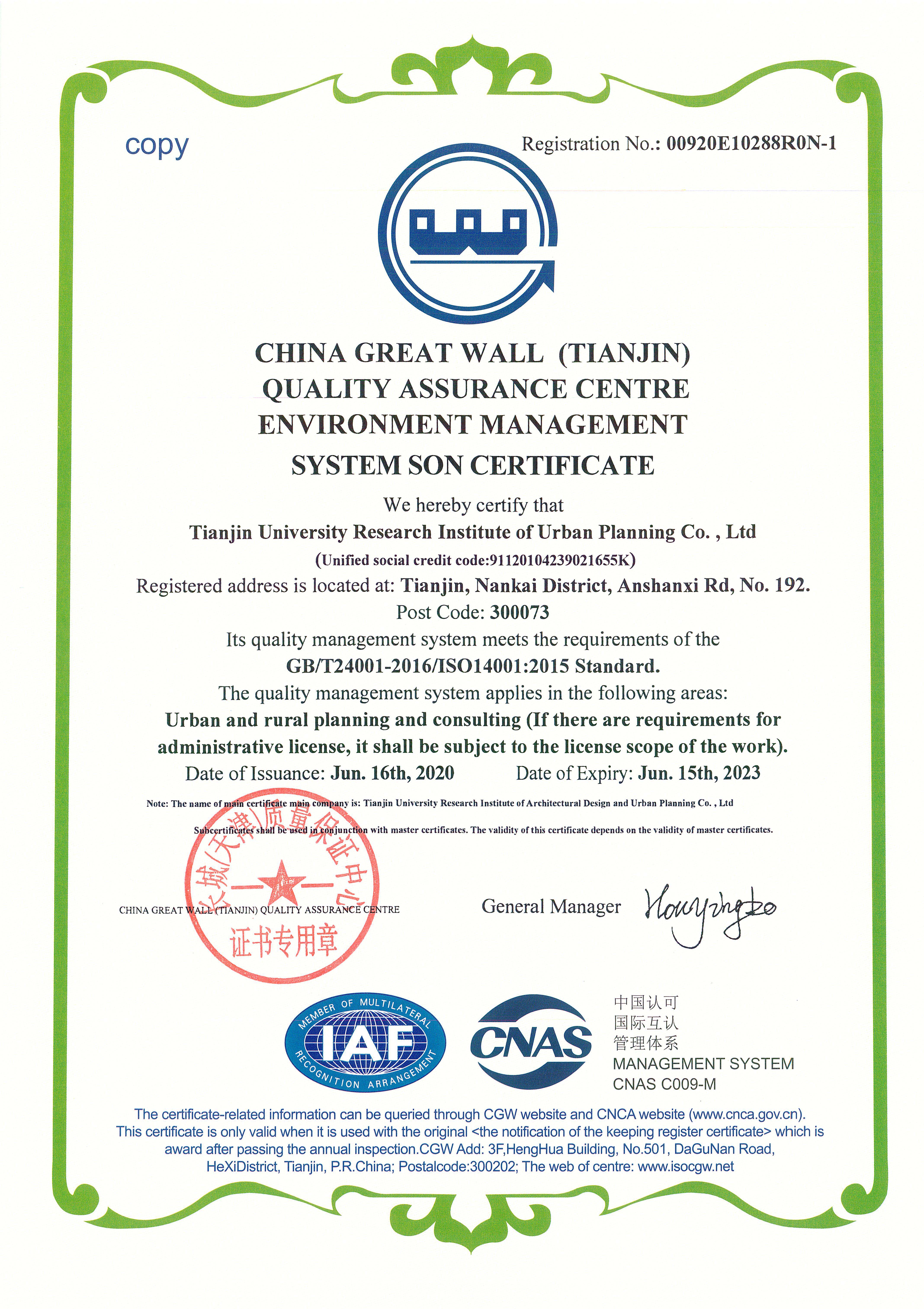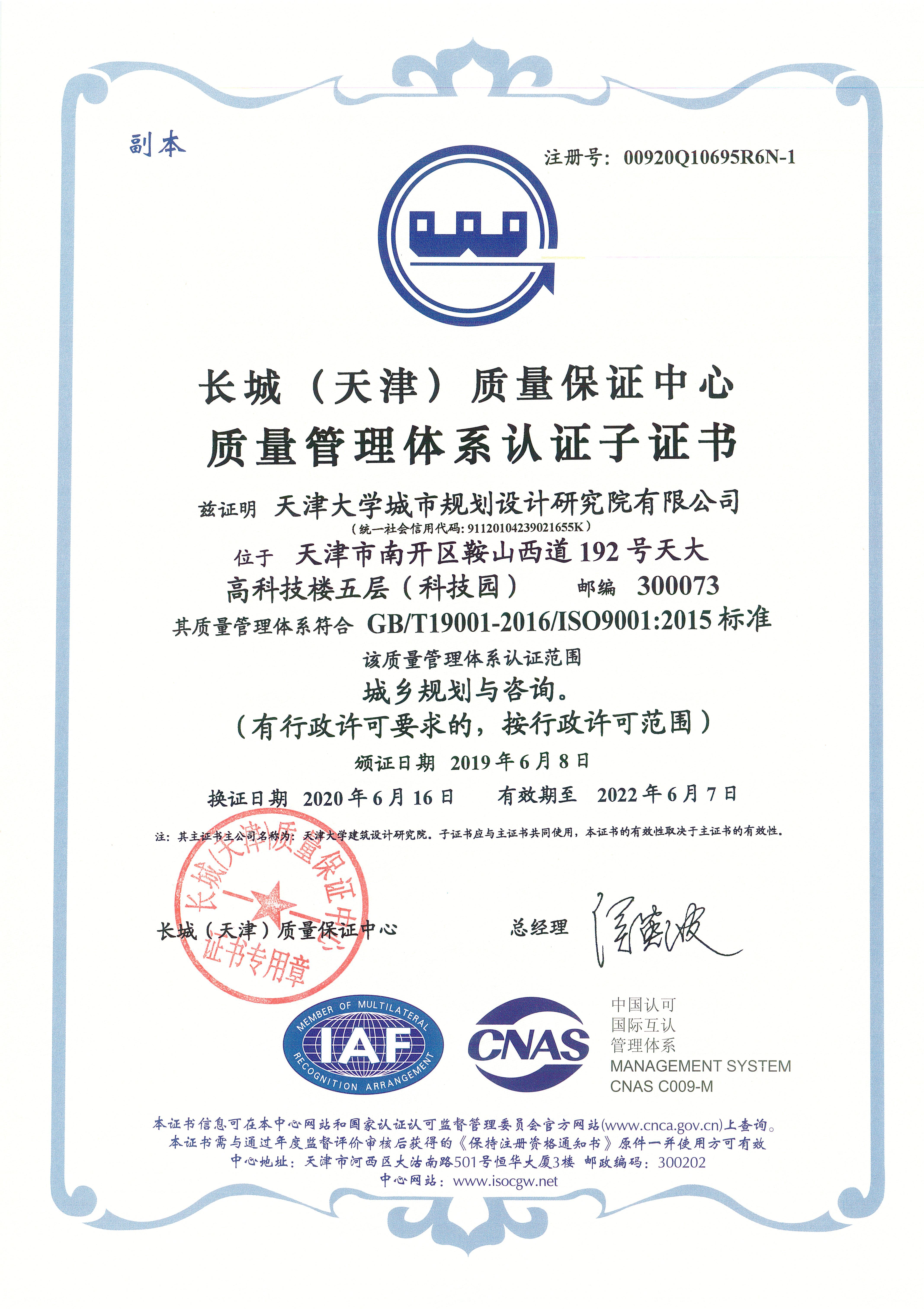 天津大學建筑設計規劃研究總院有限公司及天津大學城市規劃設計院有限公司獲得質量、環境、職業健康安全管理體系認證證書。