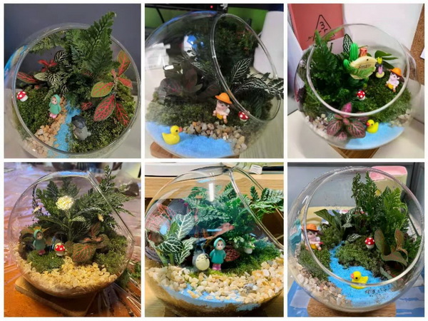 經過一個多小時的不斷嘗試和創作,大家都完成了自己獨一無二的作品,并得到老師的高度肯定。此次活動讓大家體味了大自然的美感,凈化心靈,陶冶情操,使我們更加熱愛生活。小小的微景觀縮短了我們與大自然的距離,使我們的辦公生活更增添一份美感和溫馨,勞累疲憊時抬頭瞥見那一抹綠色,仿佛降臨到一個簡單純凈的童話世界。
