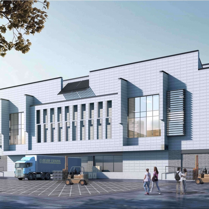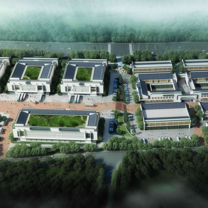 相較于其他冷鏈物流項目,本項目規(guī)模適中,業(yè)態(tài)種類全面。包含冷庫、常溫庫、食品加工、第三方物流、農(nóng)貿(mào)市場、配套辦公及公寓等多種功能。方案結(jié)合場地設(shè)計,將商業(yè)功能和物流功能按東西兩側(cè)分別集中布置,功能相對集約。東西向的交通軸線聯(lián)系兩個功能區(qū),實現(xiàn)一種“前店后廠”的經(jīng)營模式。同時布局上充分考慮北側(cè)主干路的沿街展示效果,打造起伏的城市天際線,增強園區(qū)的標(biāo)識性。