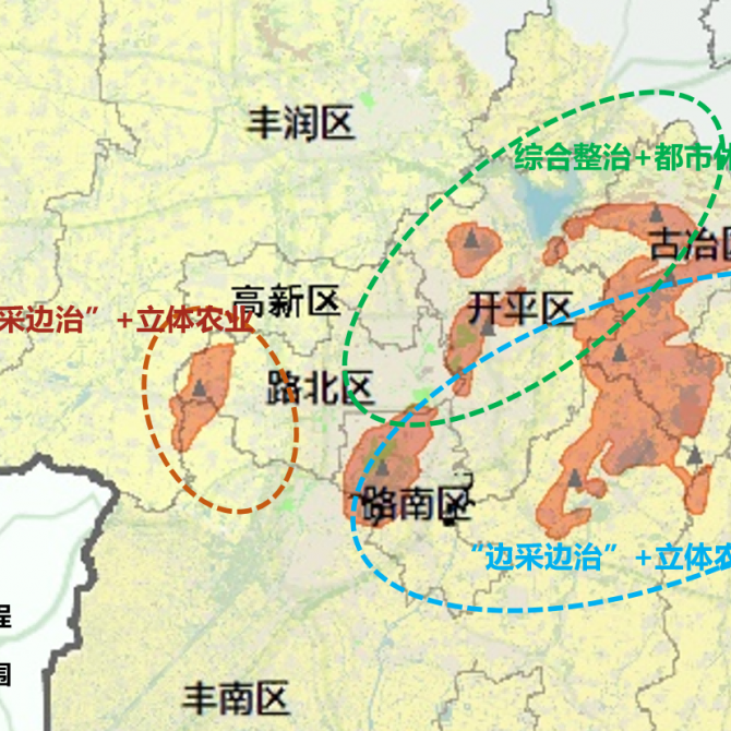 以生態(tài)產(chǎn)品價值實現(xiàn)導(dǎo)向,顯性修復(fù)與隱性修復(fù)相統(tǒng)一,建立“格局引領(lǐng)-過程耦合-分區(qū)集成”的系統(tǒng)化修復(fù)路徑。錨固生態(tài)安全格局、劃分生態(tài)修復(fù)二級分區(qū),識別7類重點修復(fù)區(qū)域,其中采煤塌陷區(qū)著重探索“生態(tài)+”治理、利用型修復(fù)模式。