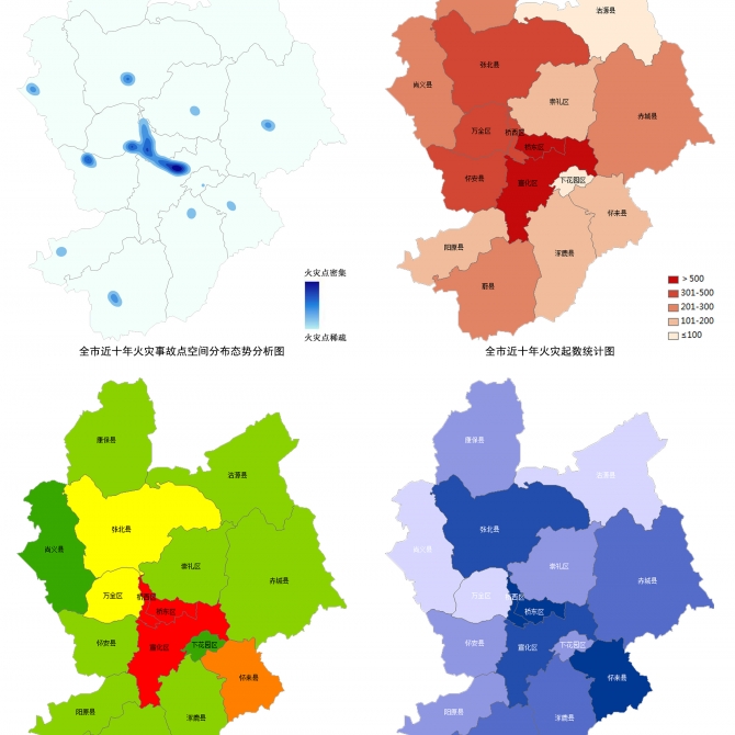 排查市域2444棟高層建筑最大高度與消防最大舉高能力的匹配缺口,并將關鍵信息納入張家口城市GIS管理平臺系統,建立可視化的管理臺賬。市域深度分析全市火災事故歷史數據,科學總結火災發生的趨勢,利用鄰域分析、空間疊加分析等多種技術手段,直觀呈現全市消防安全的敏感地區和薄弱地區。主城區建立以致災因子、孕災環境、易損性為導向的火災風險評價體系,多維度精準定位危險源集中區。
