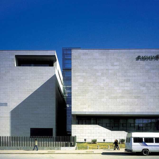天津美術學院美術館是一座復合功能的美術館,包括展覽館、報告廳、文化超市、創(chuàng)作工作室、圖書館及教學用房等六個主要功能區(qū)及地下停車庫。建筑主體由四幢多層裙房和一幢高層塔樓組成,主入口臺階、兩道斜墻、玻璃天棚、空中步廊以及一座通透挺拔的玻璃光庭將幾組體塊聯(lián)系在一起。