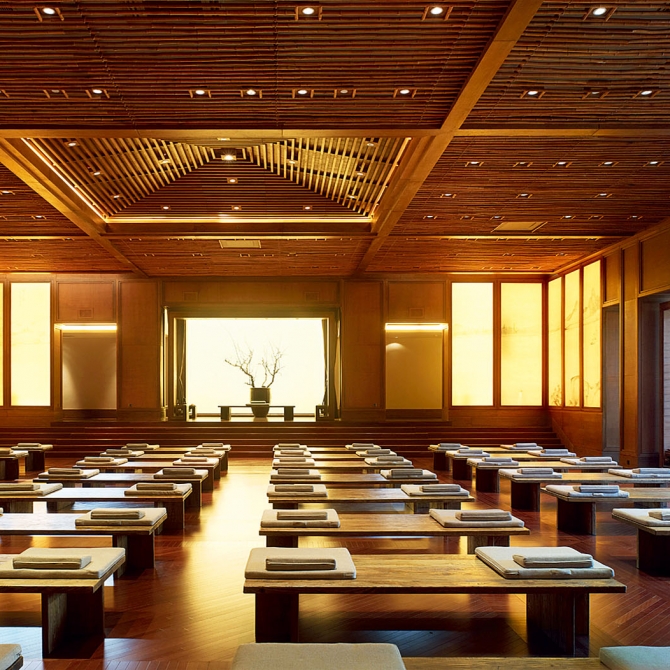 公共空間的設(shè)置和組織強化了禪修中心的場所感和儀式性,可以使修習人士放下“我執(zhí)”,融入“佛門”;私人空間的領(lǐng)域感、視線上的純凈以及洞穴般低矮、小巧的尺度,則給個人清修提供了良好的環(huán)境。禪修中心設(shè)計核心理念的體現(xiàn)也恰在于:將禪修學員私人的領(lǐng)域以小院為中心成簇組織,面對庭院內(nèi)部的古樹、枯山水以及一方天空,使“放下自我”的修習人士可以面對自然、體味生命、聆聽內(nèi)心,從而體現(xiàn)出佛教“寓物山恒在,恬心水任流”的“即景證心”的觀照方式。
