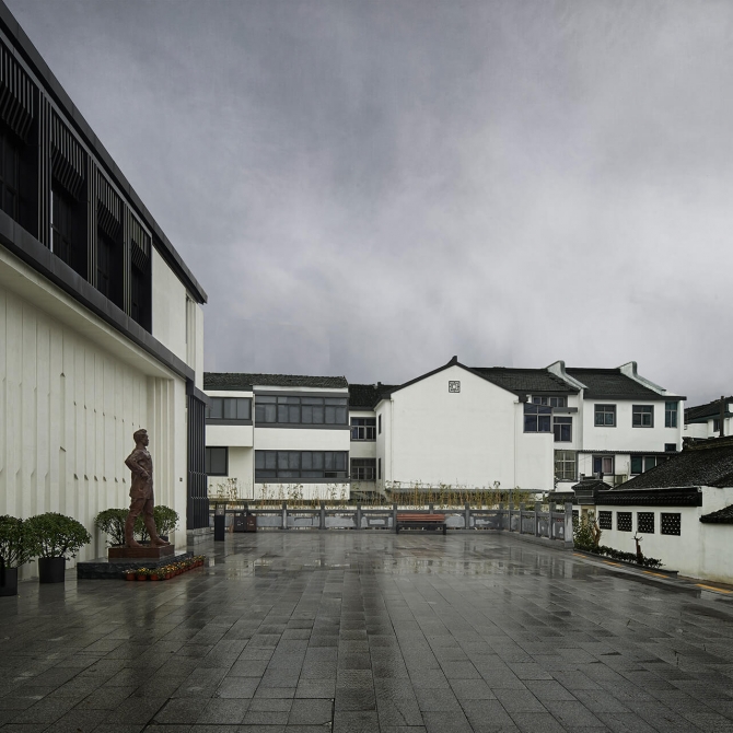 景觀廣場以物喻德,以園寫意,通過景觀設計營造純凈淡雅的紀念空間氛圍,體現張太雷的革命精神;北廣場以開敞空間為主,保證人流集散,在建筑軸線上設置升旗臺;廣場東側為保留民居,設置生生不息園結合種植進行視線遮擋;南部設置庭院空間形成新舊建筑間合理過渡。