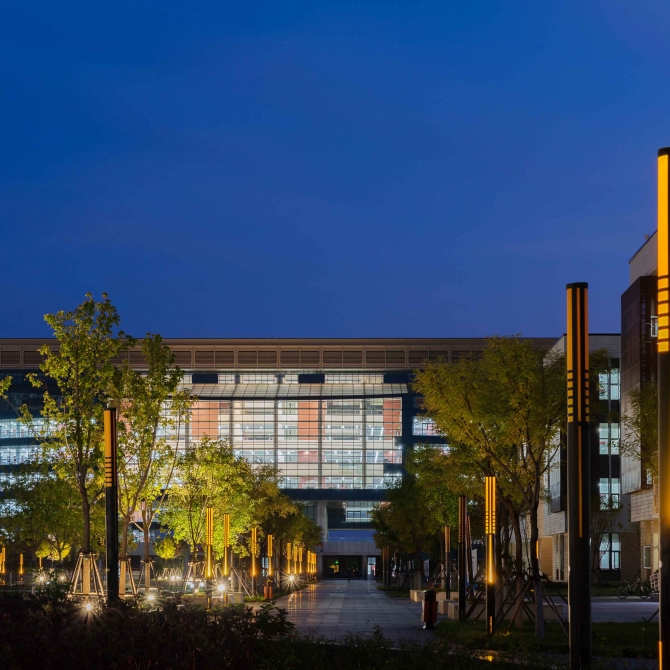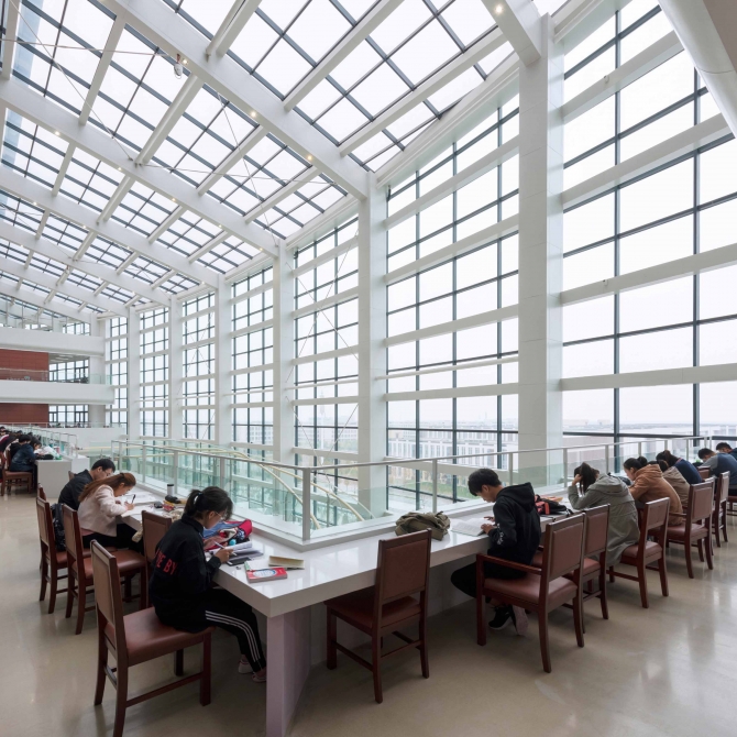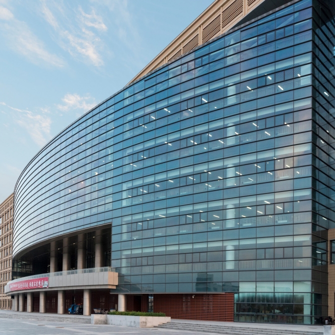 華北理工大學新校區(qū)圖書館位于校園的主軸線上,設計藏書量300萬冊,設計閱覽座位4700個。功能除圖書館外,還包括中國德育館、美術館、校史館、學校網(wǎng)絡中心、電教中心、報告廳等,是一座功能復合、規(guī)模超大的現(xiàn)代化高校圖書館。