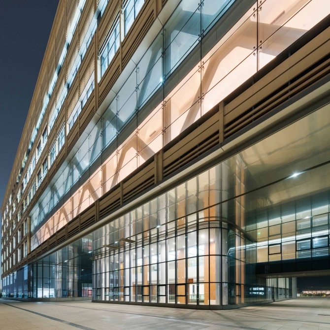 主樓在二層平臺上設計了一個長47.8米、高兩層的“門洞”,中間放置玻璃體的文化展廳,選用鋼結構的形式,設計了一個長達56.7米,高11.1米,重300噸的兩層桁架結構置于三、四層上, 從而解決了這一技術難題,實現(xiàn)了南北貫通的構想,同時此處設計索結構超白玻璃幕墻,更加直白的將結構表現(xiàn)出來。