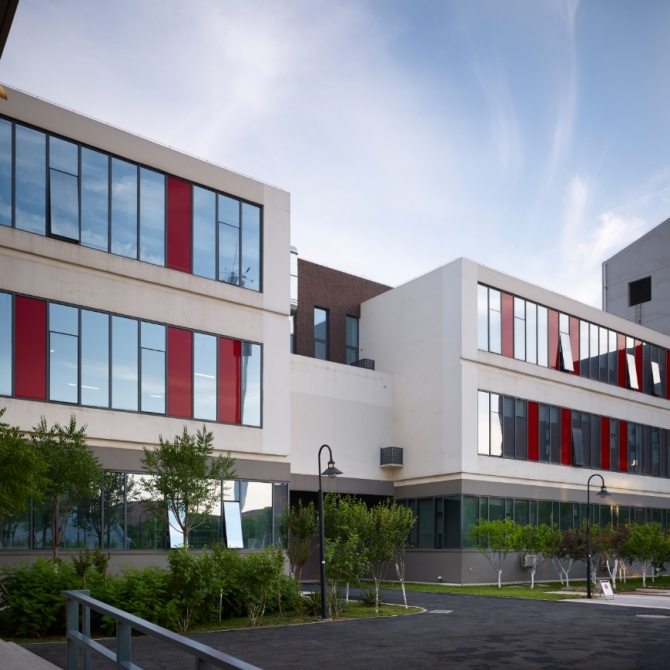 項目從整體規劃、單體造型及色彩設計上凸顯了新校區機械教學組團作為工科學院的嚴謹高效的氣質,作為整個校園對外的形象展示,提高了國家重點實驗室的展示度。 在空間設計上充分考慮實驗及教學、 辦公等功能的有機結合,實現空間利用率的最大化,滿足師生使用的多種需求。為學科發展提供最堅實的基礎。 考慮熱動大樓油庫使用的安全性,將熱動大樓規劃于整個機械學院組團的東南角,臨近高速路立交橋的交叉口,既降低了對校園內部環境的危險性影響。本項目利用多種技術手段,實現節能環保的需求。具有顯著的節能、節水和提高資源利用率的效果,有效解決關系師生健康的環境問題。