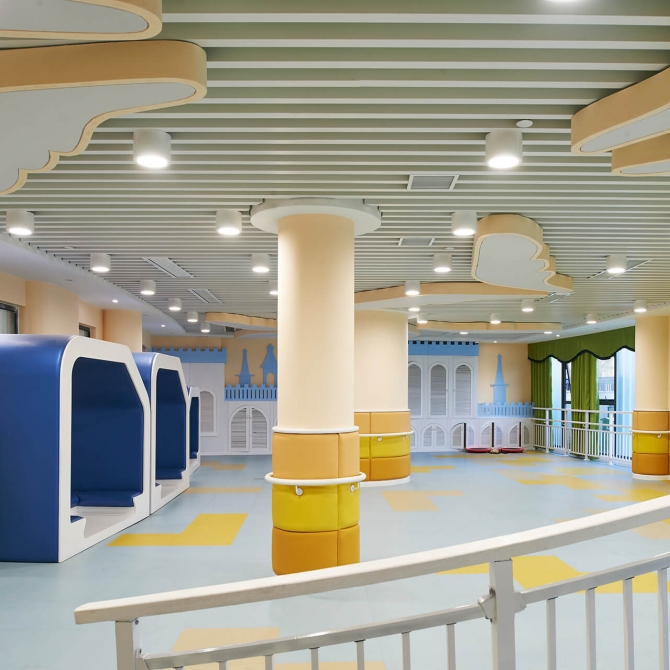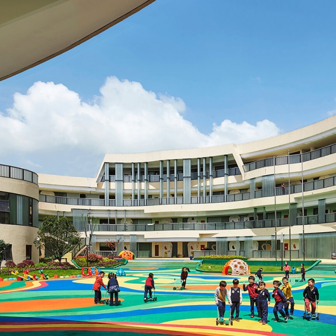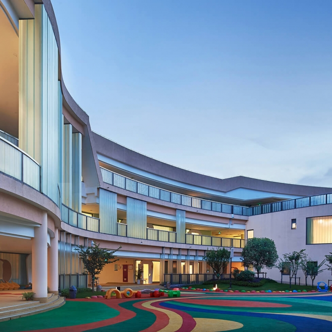 海亮國際幼兒園是一座大型寄宿制幼兒園,設(shè)計可容納500名兒童。設(shè)計基于對幼兒心理安全性與趣味性需求進行充分的響應(yīng),并關(guān)注獨特復(fù)雜地域環(huán)境的場地因素,以兒童的視角和兒童的體驗為原始出發(fā)點,以簡約而豐富的設(shè)計手法,力求創(chuàng)造出一個真正為兒童所喜愛的、歡樂的、安全的、并且充滿趣味的空間場所。