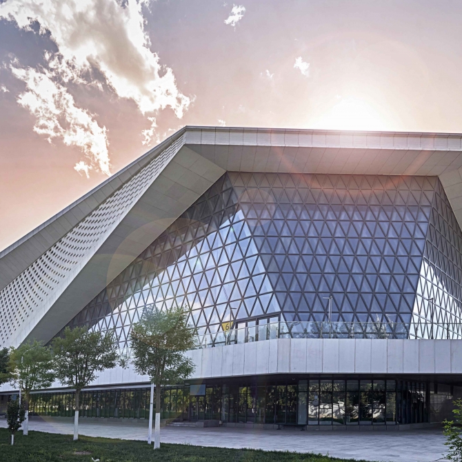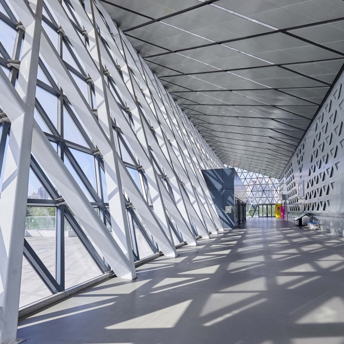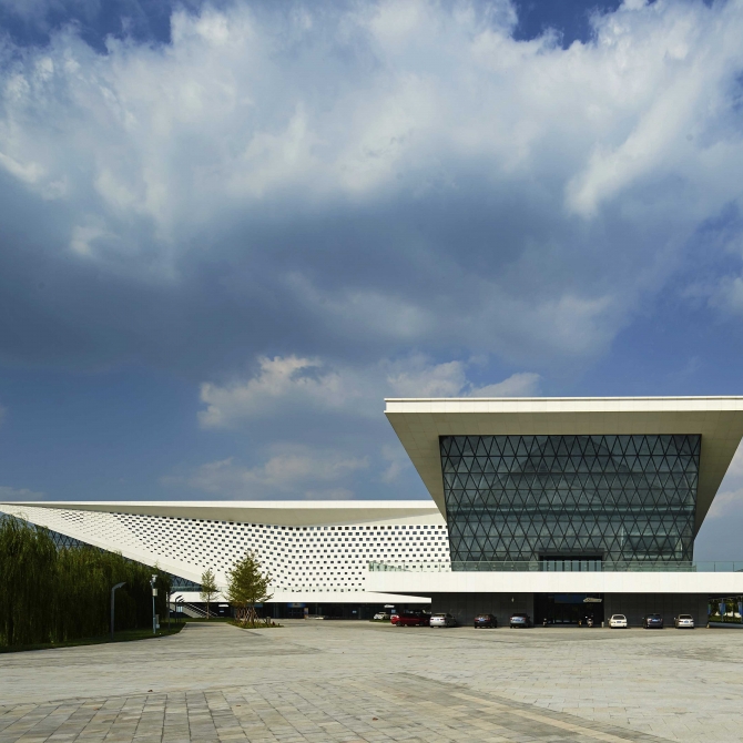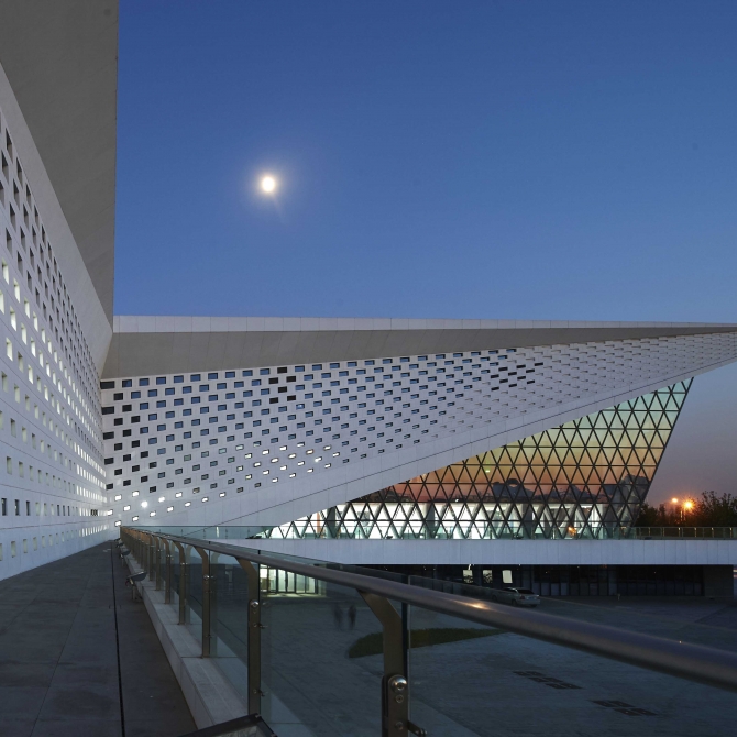 建筑師采用相對純凈包容的整體設計手法,將復雜的結構體系包含其中,利用新型建材的可塑性強的特點,進行折疊、拉伸,以中國傳統折紙的手法使其顯得輕巧活潑,與復雜的結構體系形成對比。建筑有著及其韻律感的外窗,不但保證建筑表面動感的效果,也保證純凈建筑體量效果不會過于呆板。GFRC外墻在建筑實體的內核之外形成半透明空間,其間布置觀眾通道所必須的交通設施,通往室外大平臺和樓梯穿插其間,給行走期間的人們一種難以忘懷的體驗。