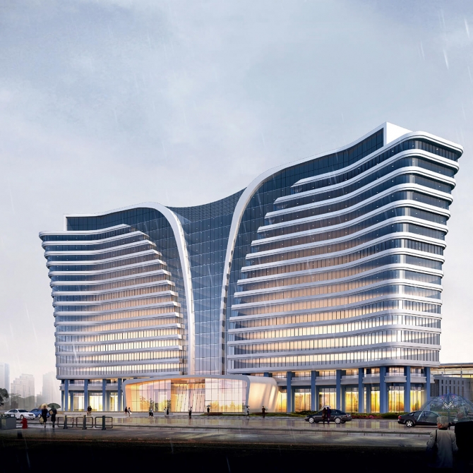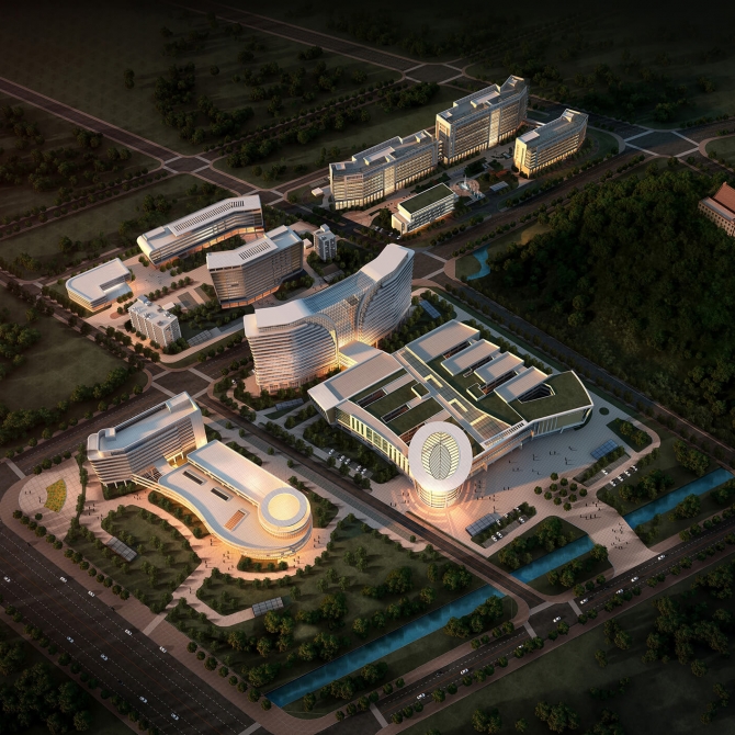 建筑組群中以“龍鳳呈祥”意向的建筑實(shí)軸與“山水相依”意向的景觀虛軸為空間構(gòu)架,兩軸線相得益彰,構(gòu)圖豐滿有序。建筑群體通過(guò)一個(gè)曲線形的玻璃景觀風(fēng)雨連廊將門診樓、病房樓專科醫(yī)院、辦公區(qū)、老年保健院的四個(gè)組團(tuán)串聯(lián)起來(lái),各個(gè)組團(tuán)相互聯(lián)系,并相對(duì)獨(dú)立,使用方便。