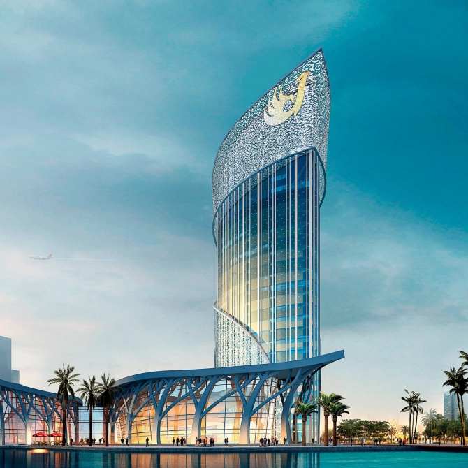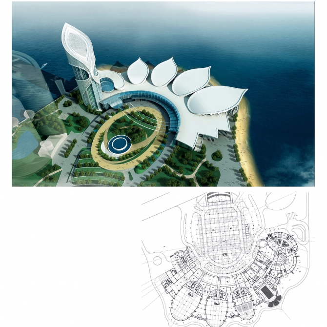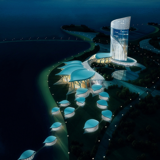曹妃甸本是一片荒灘濕地,方案設(shè)計希望通過一組充滿動感的建筑群體來展示一個從荒灘小鳥身上的羽毛最終幻化成為鳳凰羽翼的奇妙過程,以此體現(xiàn)出曹妃甸從一個海邊荒灘變成國際生態(tài)城的偉大奇跡,同時體現(xiàn)出曹妃甸國際論壇“可持續(xù)發(fā)展”的永久主題。同時通過形似鳳凰羽翼的建筑,明確地體現(xiàn)出“曹妃甸國際論壇”所在地—唐山的特點,進(jìn)而體現(xiàn)出“曹妃甸國際論壇”建筑區(qū)別于國內(nèi)外所有其它的國際論壇建筑的唯一性和標(biāo)志性。