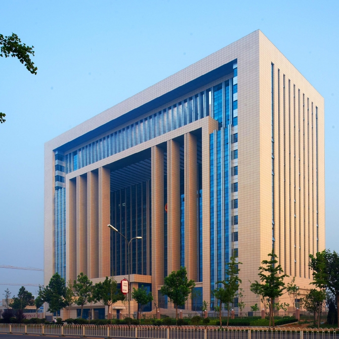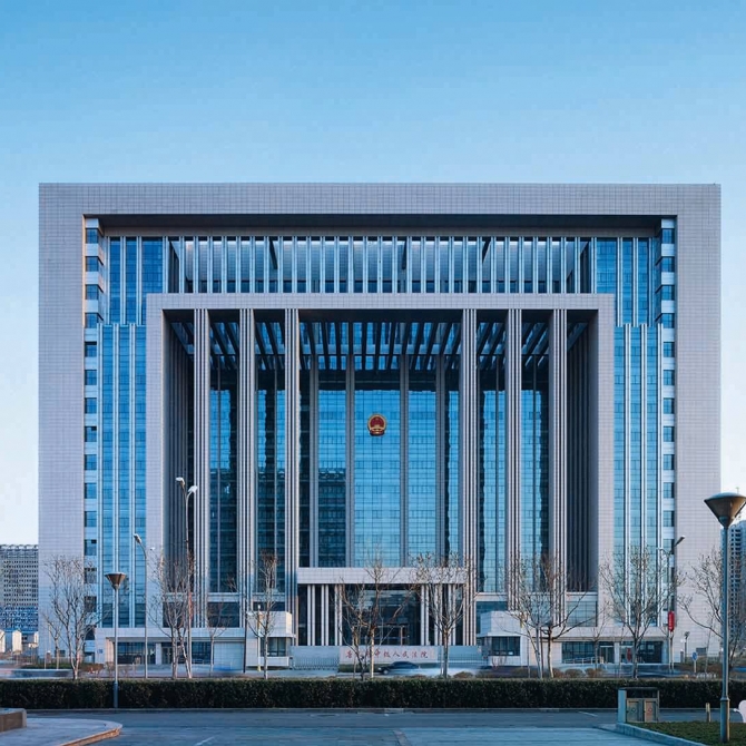 唐山中級人民法院綜合審判樓地處唐山市鳳凰新城,地上十六層,地下一層。采用正方形為設計母題,以一個完整的幾何體量塑造出了“正義之門”的建筑形象。