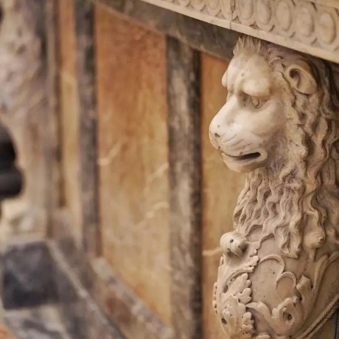 在吧臺的周圍環繞著14根黑褐色大理石柱。在圓柱兩側,還分布著許多漢白玉獅子,質感高雅,雕琢精致,形態各異,栩栩如生。抬頭一看,還能窺見大廳中央極具歐式風情的圓弧形穹頂,大概有三層樓高,很是宏偉。走近一看,頂部還有一幅手工繪制的“咖啡樹蔭”畫作。