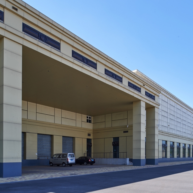 紅酒倉庫外立面設計保留了古典建筑的比例,將古典的建筑語言抽象化,形成更為簡潔、現代的建筑立面元素;外裝修材料采用米黃色、褐色纖維水泥板,結合金屬裝飾帶,使建筑整體體現出帶有古典比例的現代化物流站的建筑形象。