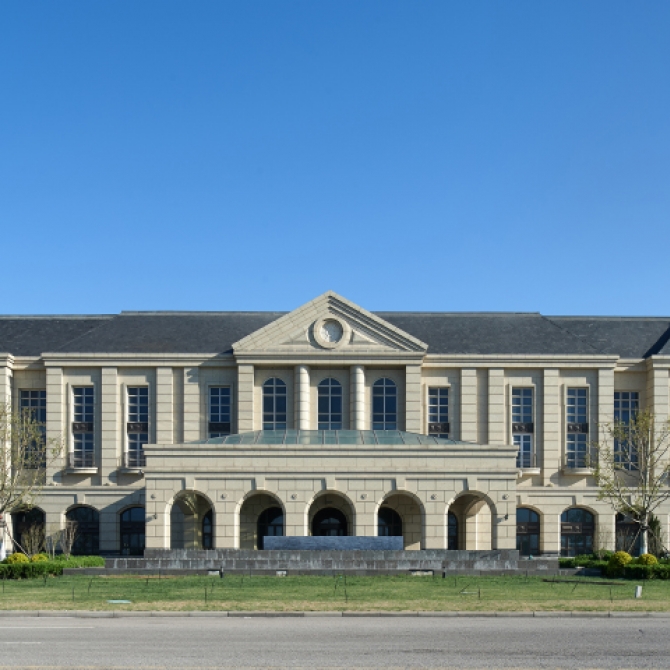 附屬用房呼應天津的文脈特征,結合紅酒莊園建筑的特色,采用傳統歐式建筑語言,首層采用拱券和券心石的開窗元素,二層開窗使用窗套和帶有花紋的鋁板裝飾,頂部為坡屋頂和局部平屋頂相結合的建筑形式。外裝修材料采用米黃色石材搭配古銅色鋁板,屋頂采用板石瓦屋面。