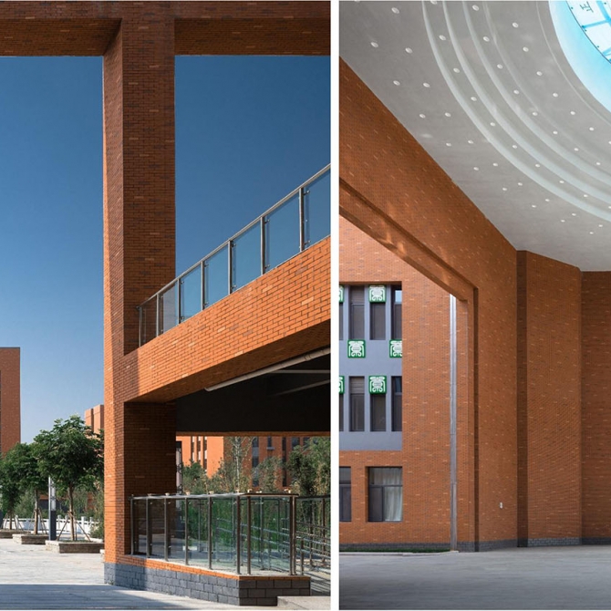 在校園的單體建筑設計中,力求打造具有章丘四中文化的現代時尚的建筑風格。校園以紅磚建筑為主要色調,灰白色體塊穿插其中,既體現中國書院獨具魅力的典雅精神,又展現了現代素質教育中學的時尚風采。