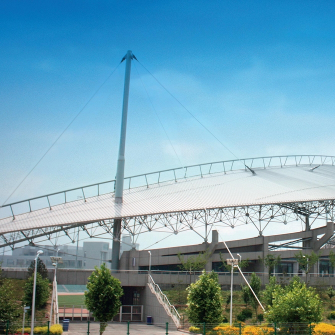 主體育場彎月狀屋頂位于中心,其它場館望“月”而聚。圍繞主體育場的6米高的階梯狀綠化帶是規劃用地的綠化中心,也是整個區域中心的“綠肺”。