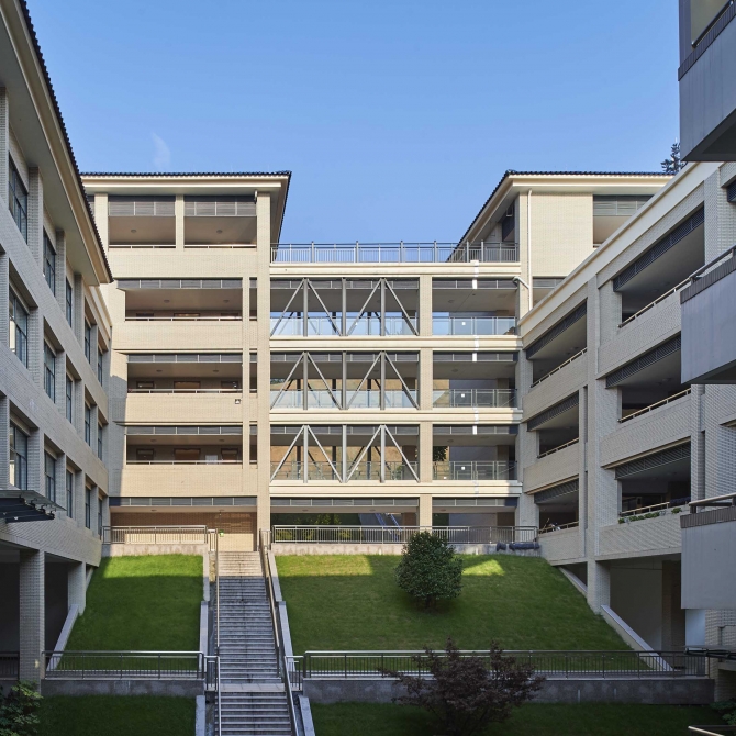 諸暨海亮高中整體風格簡潔大氣,樸素典雅。建筑形態(tài)依山傍勢、層層跌落,形成開放舒適的空間感受,創(chuàng)造出富有節(jié)奏感、層次感的特色空間,讓師生充分與自然溝通,做到場所育人,空間育人。同時,建筑設計中運用架空、鏤空、柱廊、連廊等現(xiàn)代手法及元素,既豐富了建筑造型,又為學生學習、生活提供了舒適的空間感受,體現(xiàn)了建筑設計的人性化。建筑屋頂采用平頂坡頂相結合的設計方式,呼應山地特點形成豐富的第五立面。