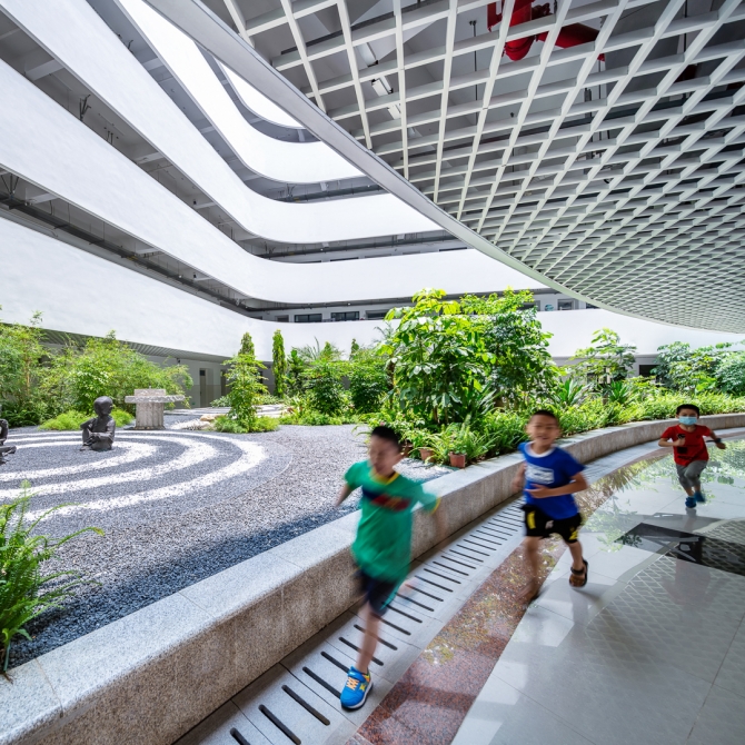 綠地結(jié)合建筑布置,增加公共空間的駐留性。用公共空間有效連接各功能空間,實現(xiàn)空間活躍有序與功能完整集中的有機(jī)統(tǒng)一。利用高差的分層設(shè)計自然地區(qū)隔了體育活動場地和教學(xué)活動場地,既互不干擾又相互關(guān)照。