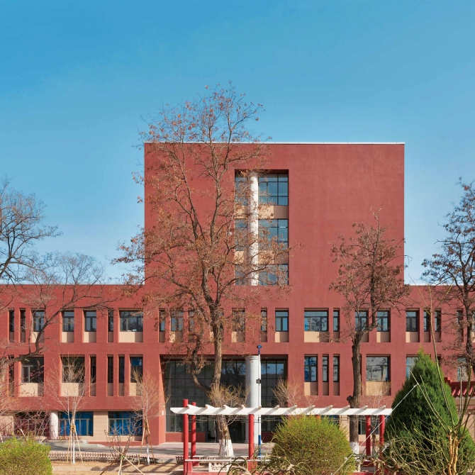 校園具有的水、電和道路條件,僅能滿足多層建筑(高度≦24米)的防火設(shè)計要求,建設(shè)資金和運維成本的嚴(yán)格限制,也不容許設(shè)計高層綜合樓。六層的分區(qū)布局可以滿足各種所需功能的展開,共享疏散樓梯和衛(wèi)生間;在滿足空間凈空規(guī)范要求的前提下,采取多重技術(shù)措施如:首層下沉0.3米,通過檐廊過渡進入門廳;密排管線且部分穿梁;樓層大跨度開間采用寬扁梁增高有效可利用空間。六層的綜合教育建筑,設(shè)計把建筑高度控制在24米內(nèi),提高了建筑平面利用率,減少了必要的消防投入。