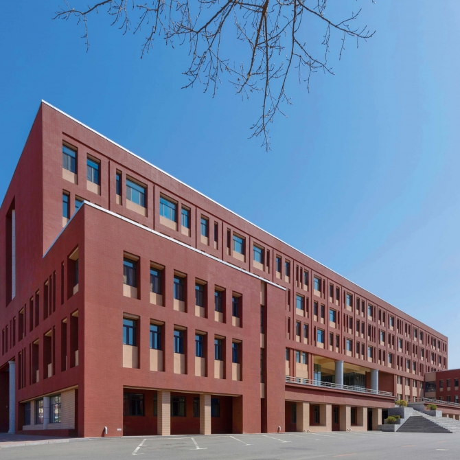 各功能體塊采取水平和豎直的空間立體組合,首層面積最大化,達到4300㎡,布置擁有較重設(shè)備又有噪音的實訓(xùn)中心;對于使用頻率高、人數(shù)多的功能空間貼近入口層布置,方便人流集散,如圖書館、教學(xué)樓、報告廳等;辦公樓需要相對獨立和安靜,避免干擾,設(shè)置在上部頂層。