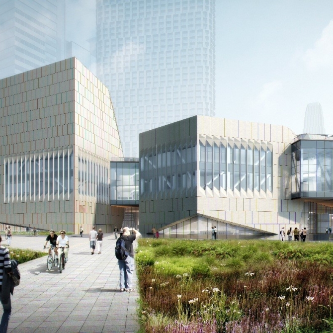 項目空間高大,設有700座劇場、黑盒子劇場各一個,訓練大廳以及一個頂部為玻璃的四季中廳。地下為框架結構,地上鋼為結構,外圍為全幕墻。