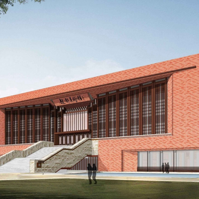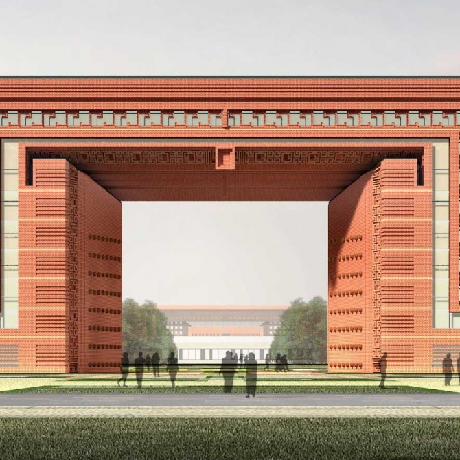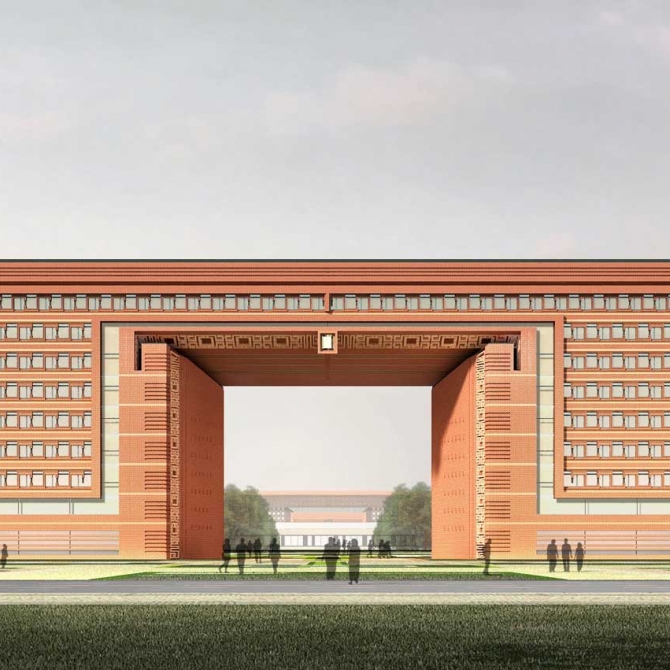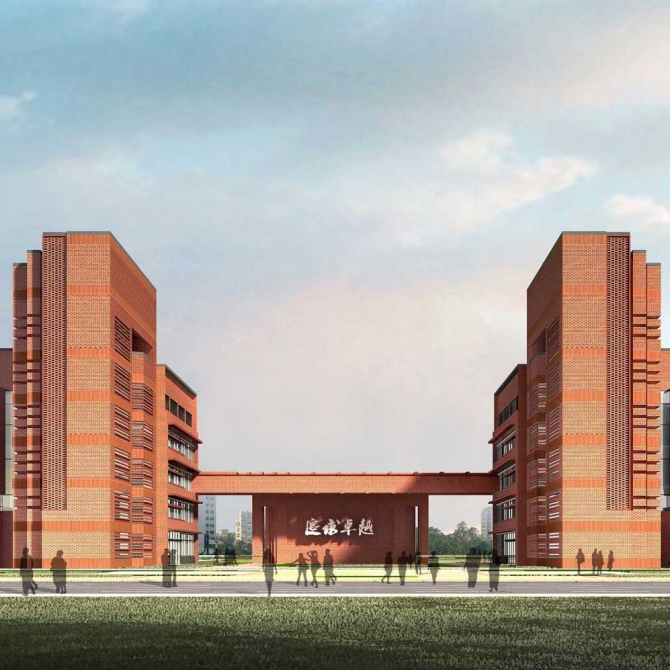 設計創新地提出了“躍龍門”的規劃布局模式。由行政辦公和實驗樓共同形成校園入口主體大樓,并與圖書館、風雨操場共同圍合出校園的主入口,打造了一個吉祥大氣校園主入口空間。學生經過鯉池,穿過龍門完成升華,取自“魚躍龍門”的吉祥寓意。在大氣中彰顯浪漫情懷,在傳統中展露現代風采。