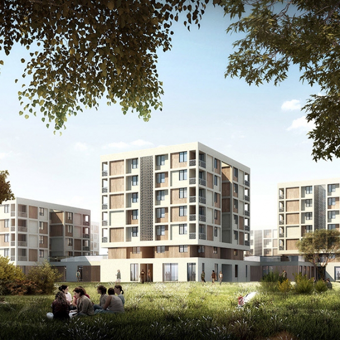 項(xiàng)目位于天津市西青區(qū)天津師范大學(xué)新校區(qū)內(nèi),總建筑面積12500平方米,滿足380位留學(xué)生入住。本案位于校園北側(cè),其主要人流來(lái)自南側(cè)教學(xué)區(qū)和生活區(qū)。廣場(chǎng)出入口處設(shè)接待中心,醒目便捷。廣場(chǎng)內(nèi)部實(shí)行人車分流,僅允許行人和非機(jī)動(dòng)車進(jìn)入,行人亦可通過(guò)首層架空灰空間到達(dá)校園主環(huán)路及校園濕地景觀。優(yōu)美弧線的室外觀景平臺(tái),宛如一條紐帶將錯(cuò)落有致的宿舍有機(jī)聯(lián)系到一起,內(nèi)側(cè)形成一個(gè)半圍合的景觀庭院。本案采用白色和仿木紋水泥纖維板作為建筑外檐材料。通過(guò)簡(jiǎn)潔的白色骨架,木色和白色相間的建筑墻面的設(shè)計(jì)元素和手法,體現(xiàn)中式匠心獨(dú)運(yùn)的文化內(nèi)涵。
