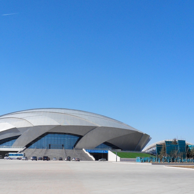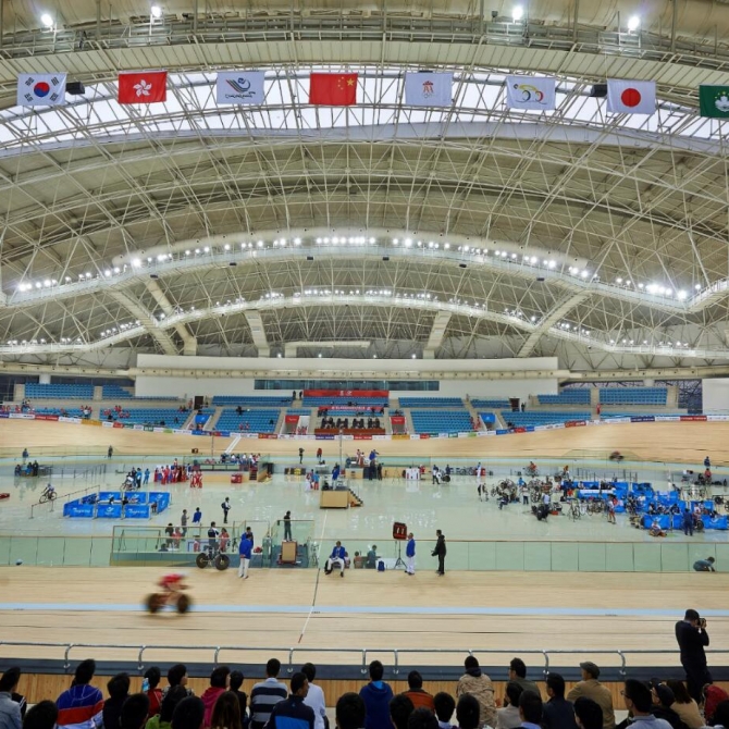 天津團泊自行車館是第六屆東亞運動會的主要場館,用地面積 8.17萬平方米,總建筑面積2.82萬平方米,建筑總高度40.2米。