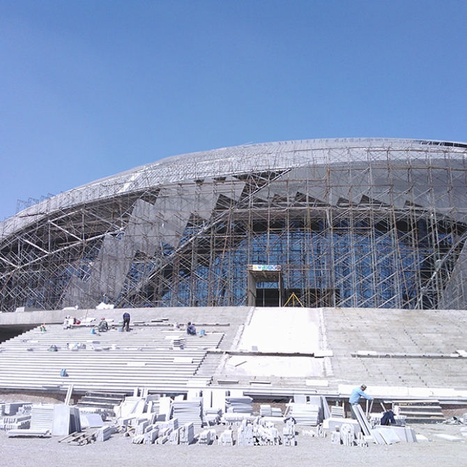 場館整體造型類似自行車比賽選手所戴的頭盔。屋蓋主體采用桁架和雙層網(wǎng)殼組合的空間結(jié)構(gòu),網(wǎng)殼周邊采用環(huán)向鋼索弦支。屋蓋從周邊支撐向外設(shè)單層網(wǎng)殼懸挑延伸并局部向下延伸。屋蓋周圈支撐在24個圓截面混凝土柱上。結(jié)構(gòu)整體平面投影為橢圓形,長軸跨度126米,短軸跨度100米,矢高18米,柱頂支撐標高19米。
