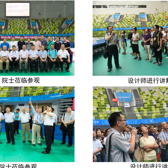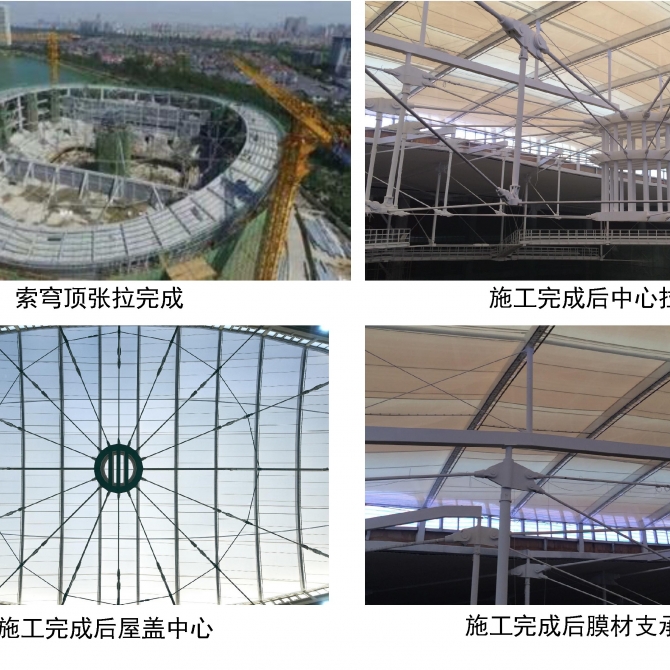 天津理工大學體育館主體結構采用鋼筋混凝土框架,屋蓋平面投影為橢圓形,長軸102米,短軸82米,通過方案對比分析,屋蓋采用外圈Levy、內圈Geiger的新型復合式索穹頂結構,索穹頂周圈錨固于混凝土環梁,環梁呈馬鞍形,短軸為最高點,長軸為最低點,最高點和最低點高差5.455米,該項目是目前國內建成跨度最大的復合式索穹頂結構。