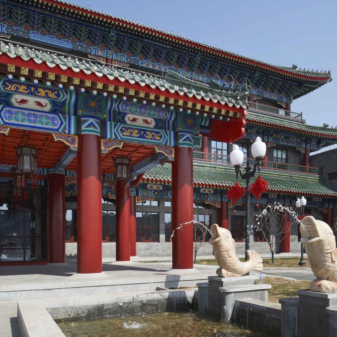 本項目建筑風格為仿明清北方傳統中式古建筑,主體為三層廡殿建筑,兩側為兩層硬山與三層歇山建筑,采用中心對稱的手法,主入口與望海樓遙相呼應。商務中心包括餐飲、會議及客房,形式規整。