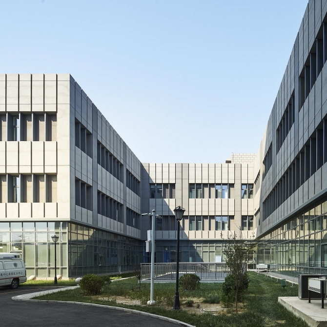 武清第二人民醫院主要含三層門診醫技樓、十一層住院樓,及單建的發熱、感染門診和動力中心。門診醫技樓按診區展開并圍合成為若干院落空間,達到良好的通風采光效果;住院樓獨立設置,與門診樓形成有機聯系,并為醫院留出發展擴建用地。