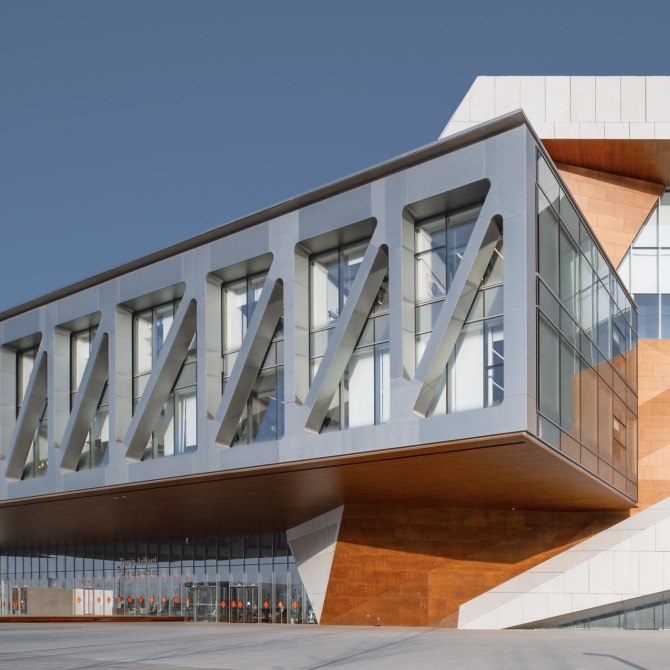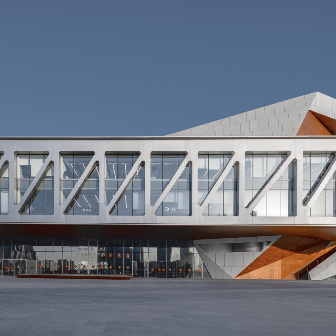 天津茱莉亞音樂學院總建筑面積3.6萬平米,地上5層,地下2層,音樂學院包含4個主要表演場館:音樂廳、演奏廳、黑盒劇場和排演廳,并由5座連廊將它們聯系在一起。