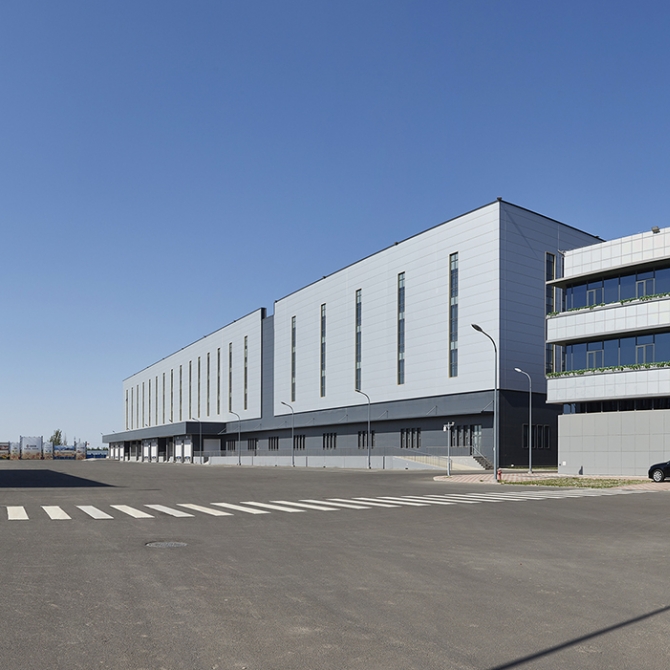 項目方案規劃布局中采用空間延續的手法。南側主入口門衛室及大門為園區起點,主入口兩側布置辦公樓與后勤生活樓以及前廣場,民用建筑豐富的立面設計表達了園區入口廣場標識性。主要倉儲、運輸功能位于辦公樓北側,物流倉庫西側設置45米寬貨車回轉區域,充分滿足物流中心功能需求。同時在后勤生活樓北側沿貨車回轉區域設置景觀綠地,一方面打破大面積物流建筑的單調性,同時為物流中心、員工提供休憩場地,體現“以人為本”的設計思想。二期建筑及場地位于一期物流倉庫北側,為物流中心的遠期建設提供合理性的規劃指導,同時在基地最北側開設出入口,充分緩解了未來園區運營所帶來的交通壓力。 物流倉庫位于地塊的中心及北側,方便形成相對獨立的物流倉儲運轉區域。