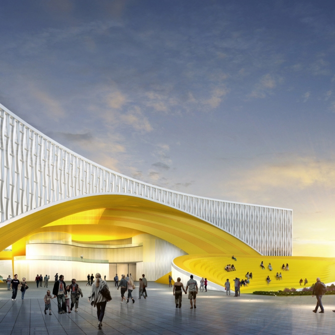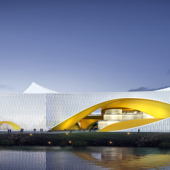1、通過設計為一個整體和諧、飄逸靈動的建筑群使這四個相關的文化藝術建筑在彰顯自身藝術魅力的同時還能在城市中形成一個和諧的整體。