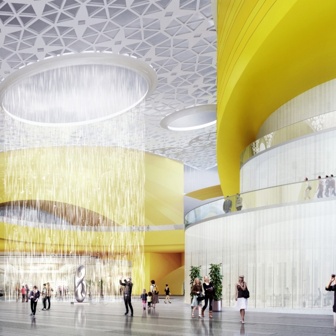 群眾文化活動中心主要包括各種開敞及封閉的文化展示空間、旅游文化商店等,并在四層集中設置了辦公、研究及會議功能。