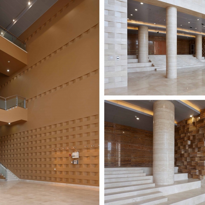 北京語言大學綜合樓位于校園內南門西側、校園中部,教學、宿舍、運動三個區域的交界處原食堂和禮堂范圍,用地面積1.3萬平方米。基地西北部有一現狀綠地需予以保留。整體建筑包括1200座劇場、辦公樓和食堂三個部分,地上建筑面積6.5萬平方米。