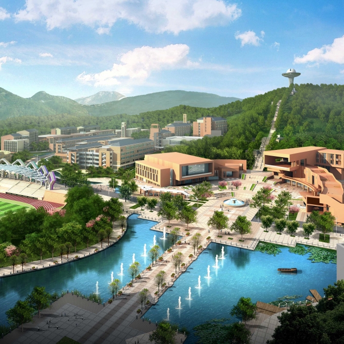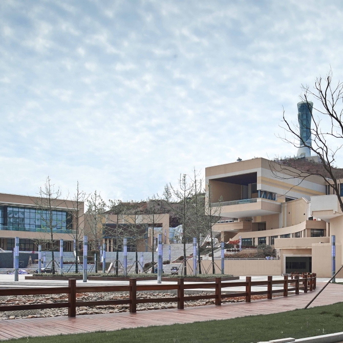 學生活動中心建設用地位于園區(qū)的東西主軸線與南北景觀大道交叉點上,風景宜人,處于園區(qū)的最佳位置,可供整個園區(qū)學生使用,風景宜人。北側國際學校區(qū),南側普通教學區(qū),東側景觀大道,西側為自然山體。總體地勢呈西高東低,東西高差9m。