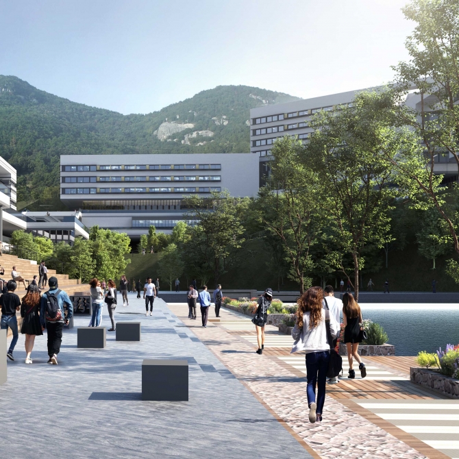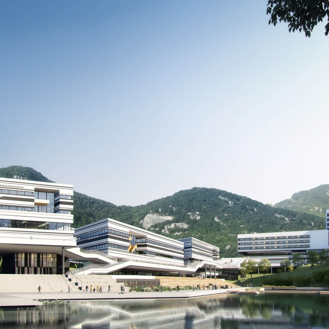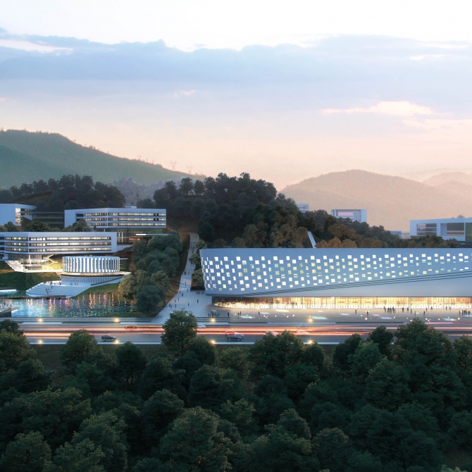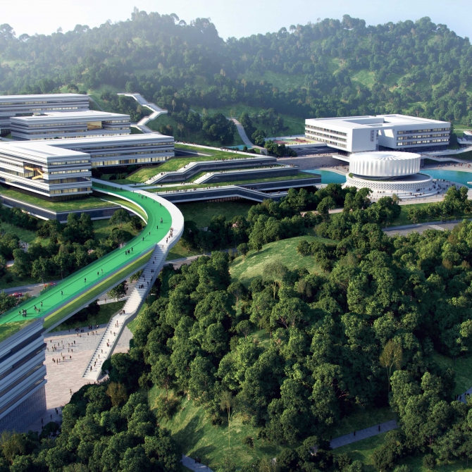 北側(cè)的教學(xué)生活區(qū)為學(xué)校的主體功能空間,建設(shè)用地沿外環(huán)路橫向展開,“一核兩園 展翼齊飛”的規(guī)劃格局,將使這里成為電力科技知識(shí)的殿堂,也成為學(xué)生美好校園生活的空間載體。“一核”, 為學(xué)術(shù)共享核,“工匠精神”大講堂及圖文中心位于校園中央,“能量環(huán)”的設(shè)計(jì)理念助力它成為整個(gè)校園的精神高地和學(xué)術(shù)燈塔。綜合實(shí)訓(xùn)、基礎(chǔ)教學(xué)、公共創(chuàng)新實(shí)驗(yàn)中心在大講堂西側(cè)沿山體帶狀展開。行政接待中心及電力科技博物館位于入口東側(cè)。整個(gè)學(xué)術(shù)共享核心建筑群結(jié)合山體臺(tái)地拾級(jí)而上,烘托出巍巍學(xué)府氣息。“兩園”為東西學(xué)生生活園,“西園”是由電力工程學(xué)院的學(xué)生生活、專業(yè)實(shí)訓(xùn)、餐飲服務(wù)以及主體育場(chǎng)和學(xué)生文體活動(dòng)中心共同組成,圍繞自然山谷的山水環(huán)境,創(chuàng)造出美好而有趣的山地校園生活空間。“東園”是由動(dòng)力、信息、經(jīng)管等綜合學(xué)科組團(tuán)的學(xué)生生活、專業(yè)實(shí)訓(xùn)以及輔體育場(chǎng)共同組成。東西兩園分別連接南側(cè)的校企互動(dòng)建筑群與公共教學(xué)實(shí)訓(xùn)區(qū),形成適合山地校園地形特征,經(jīng)濟(jì)合理,并且符合動(dòng)態(tài)生長(zhǎng)、分期建設(shè)策略的帶狀展開的校園建筑群,創(chuàng)造出“一核兩園 展翼齊飛”的整體校園空間態(tài)勢(shì)。